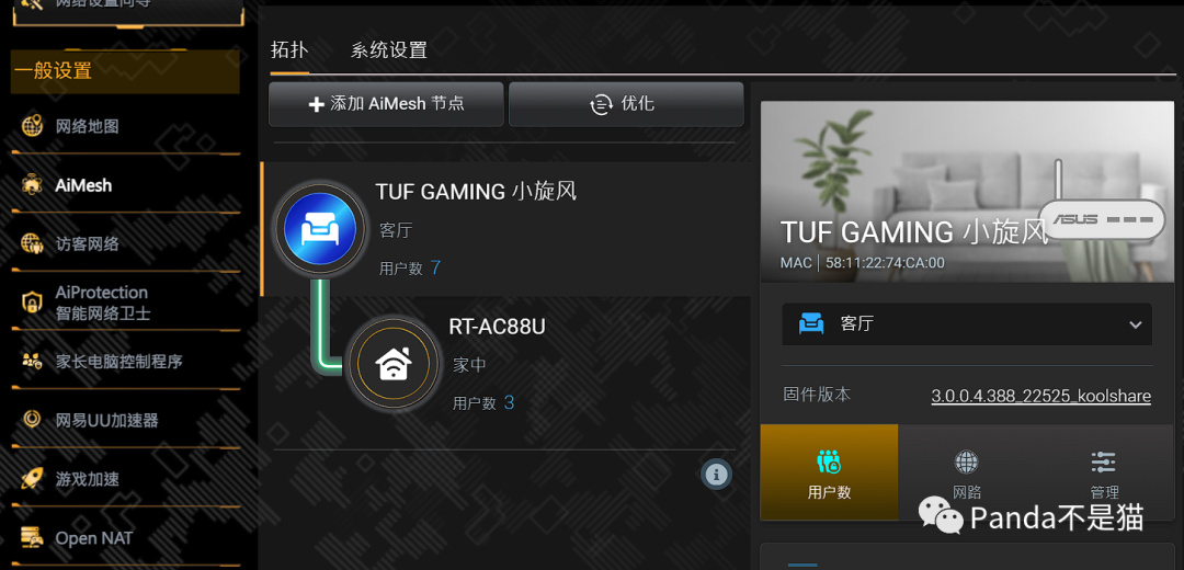 配置上华硕ax3000使用的为博朗1.7G的处理器,搭配512M的内存日常使用完全足够。并且华硕路由器家族惯有的*****以及AImesh2.0也依然是有的。而对于已经有华硕路由器的我来说,很大程度决定继续购买华硕的理由为mesh节点方便将老路由使用起来,并且拥有不错的第三方固件。