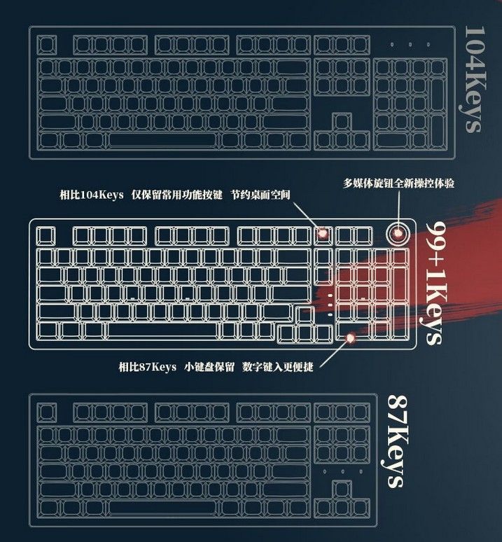 这种100个键位的配列,可以说是万金油配列,基本上可以切合各类办公需求的人群,受众更广,而且也有自己的特色,相比104和108键也更省空间。
