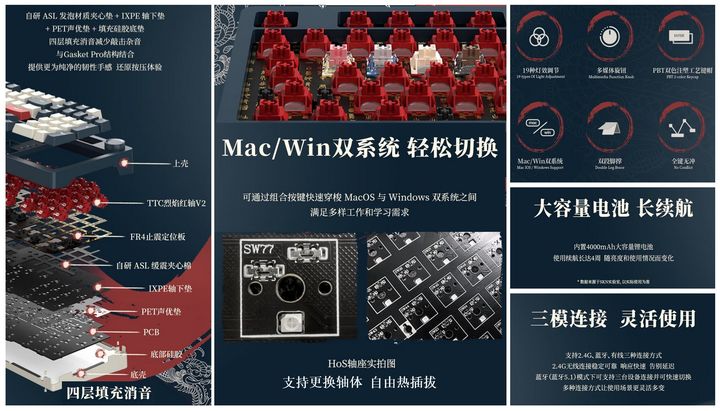 支持全键热插拔,并且这个定位板是真的好看。瞬间这种历史厚重的文字,经过设计之后,给人一下子满满的文化底蕴气息,还是暗藏在键盘缝隙之间,可窥见长河历史中的点滴,味道实在是太足了。