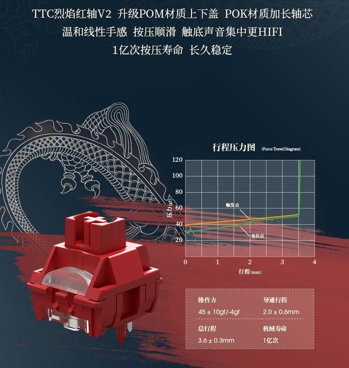 这颗轴体的直上直下的线性触发的手感,过去常见的红轴,以 Cheey 樱桃红为例,是一个45g触发,4mm完整下压行程的轴体。