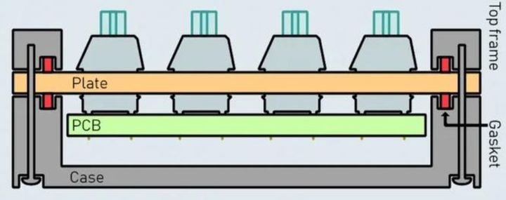 如果你用双手用力把整个键盘面往下压,你会很明显的感觉到整个键盘会微微往下陷一点点,正是这种结构的特点,不要搞误会以为是故障,因为这才是原始的GASKET结构,很多人不知道以为是做工问题,其实老玩家才能辨别出这才是GASKET该有的手感特点。