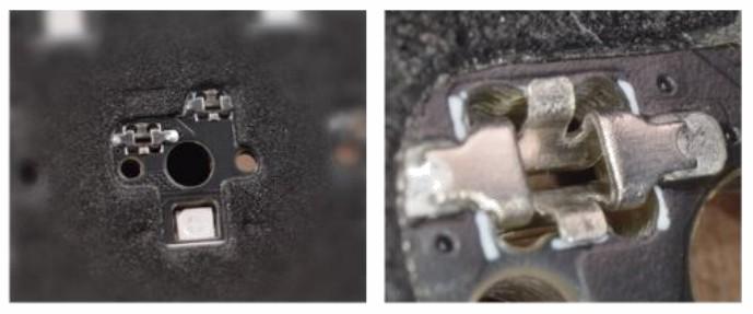 接下来看FR4定位板上的金属复合贴膜,每一个插拔键位上对应的也有标注,方便键帽安装这个热插拔设计,还使用了自研的HOS轴座,有一个单向导向口的设计,从而使得轴体金属插拔的时候更稳定,不容易弯折。