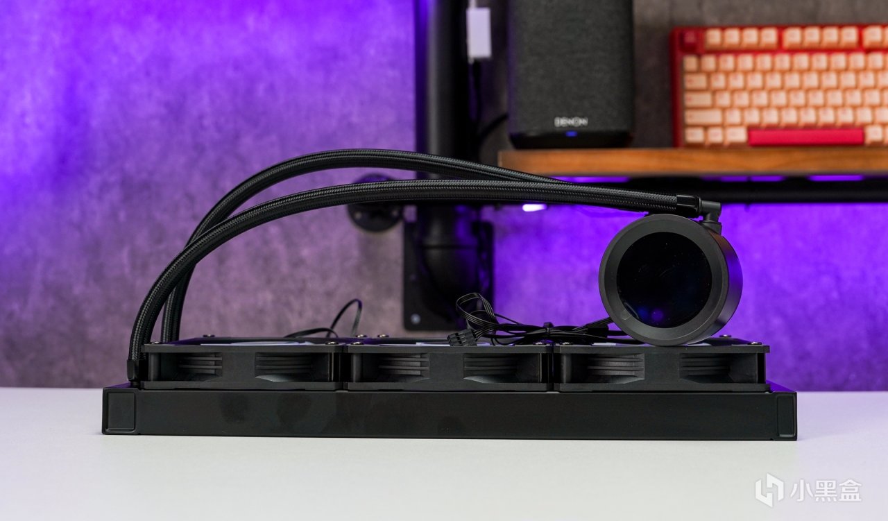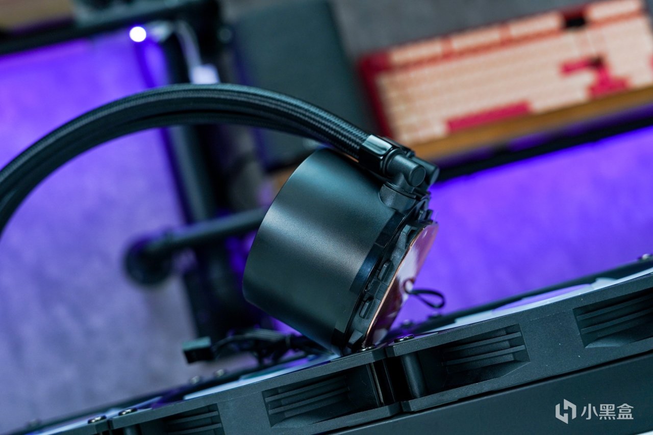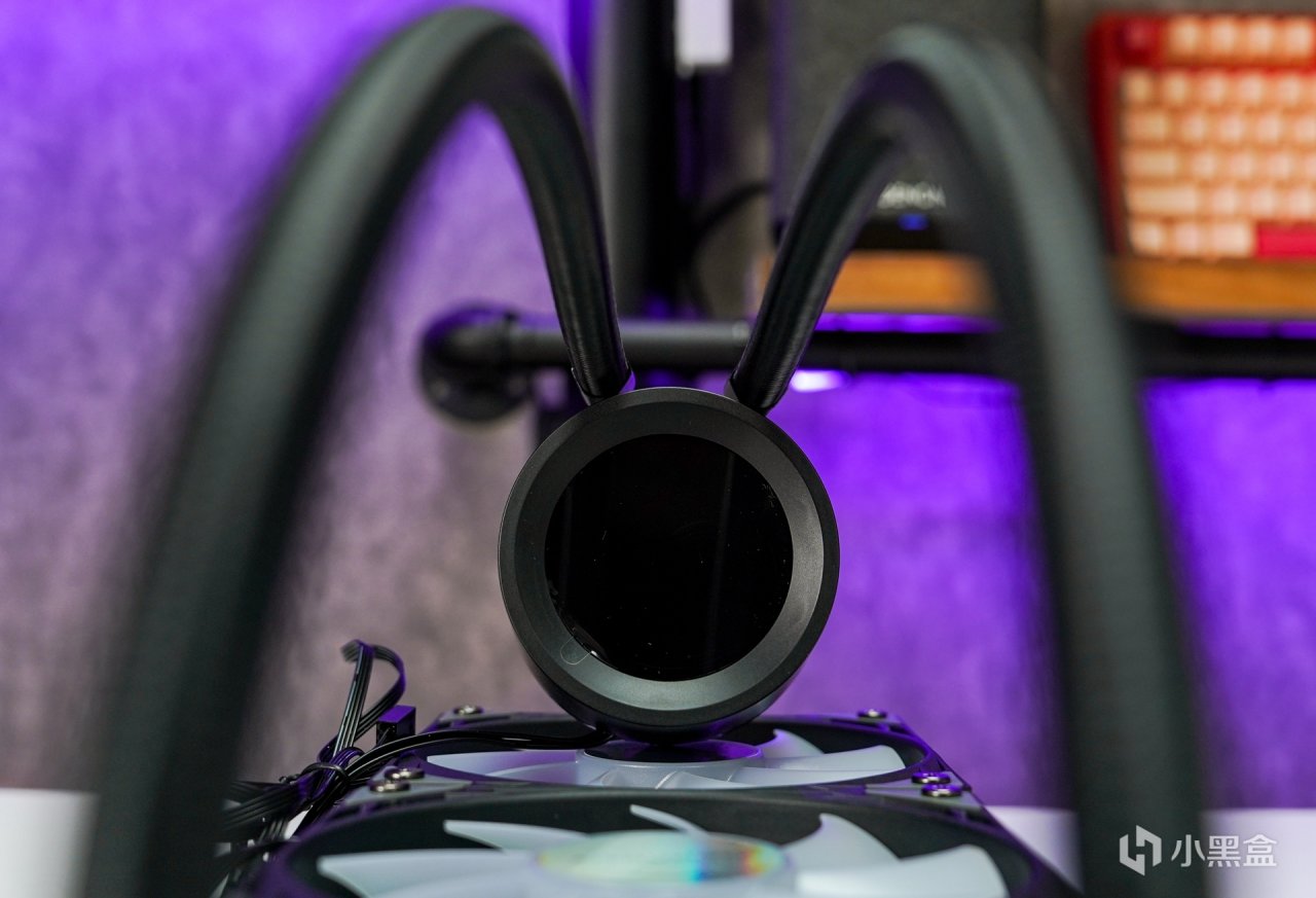 水冷標配了三把ARGB風扇,出廠已預裝至冷排上,最大轉速可達2000RPM±10%,滿載運行時的噪音≤32dBA,最高可提供78CFM的風量和3.0mm H2O的風壓,並且還自帶400MM長度的冷管大爲提升冷管的安裝長度兼容。
