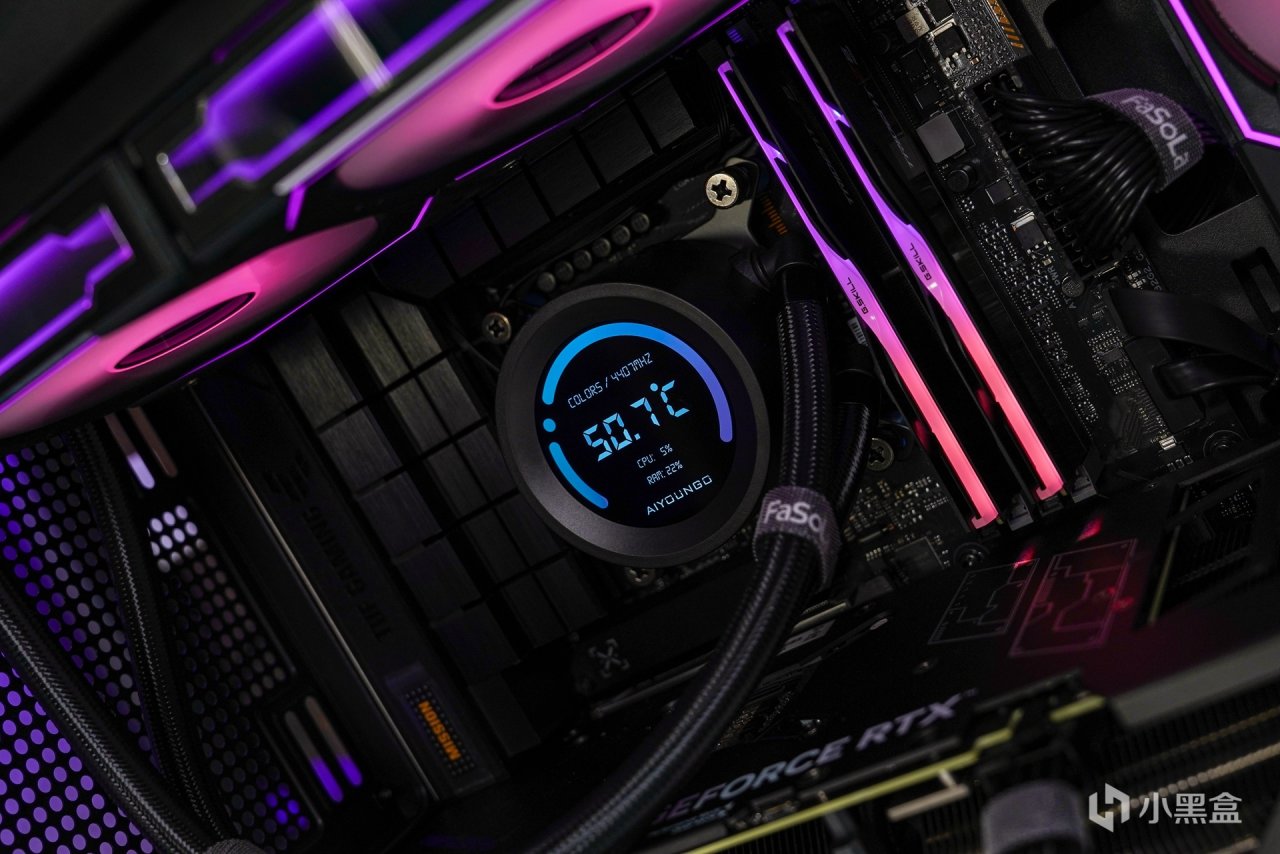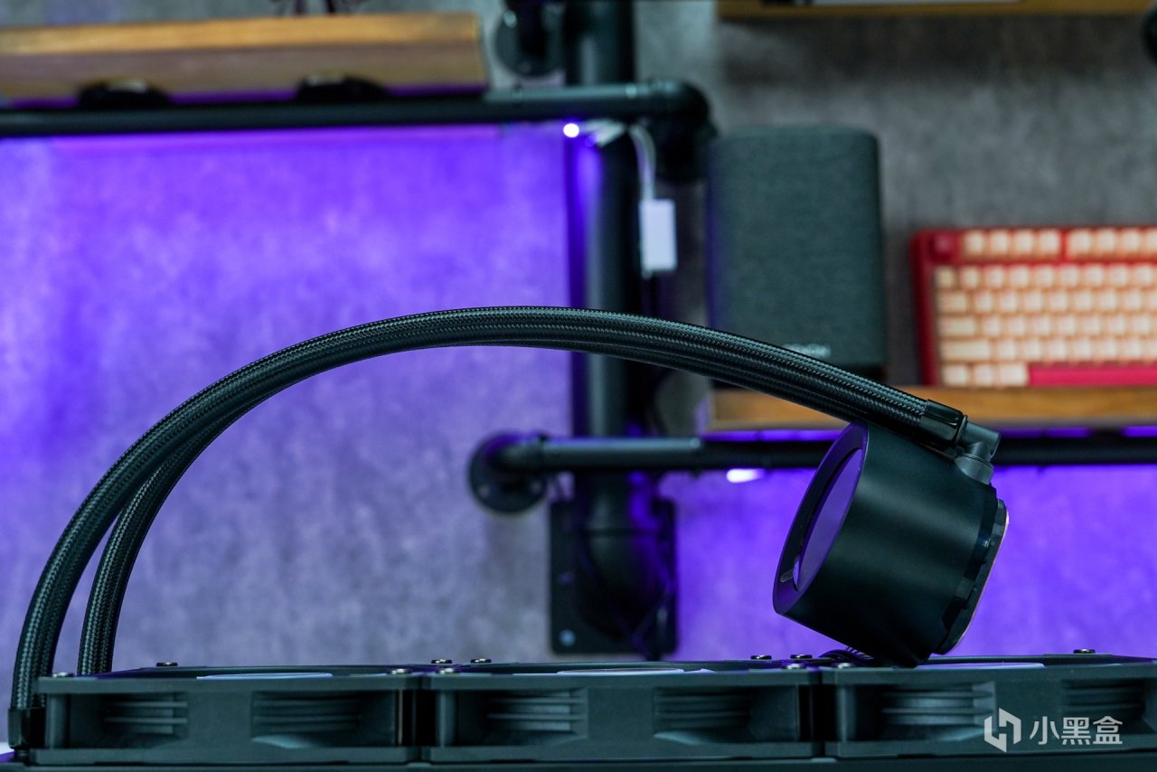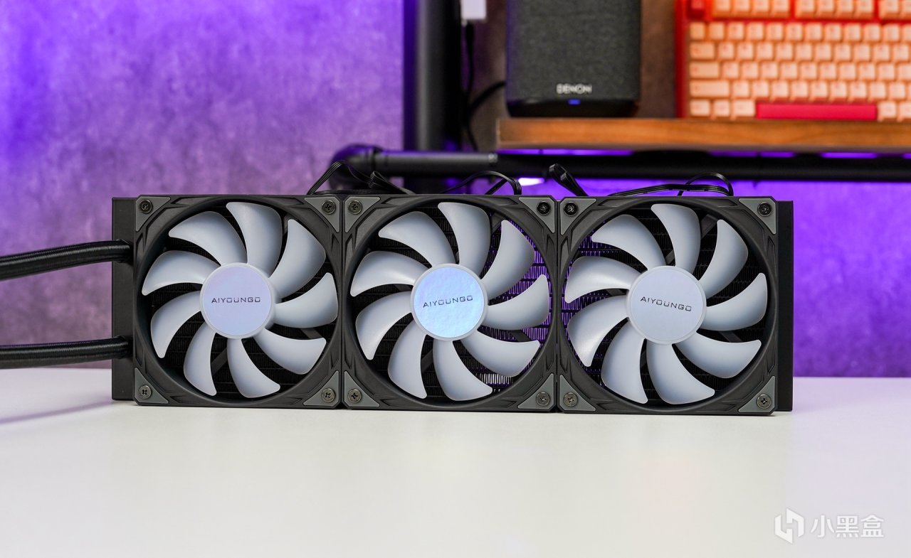 水冷標配了三把ARGB風扇,出廠已預裝至冷排上,最大轉速可達2000RPM±10%,滿載運行時的噪音≤32dBA,最高可提供78CFM的風量和3.0mm H2O的風壓,並且還自帶400MM長度的冷管大爲提升冷管的安裝長度兼容。