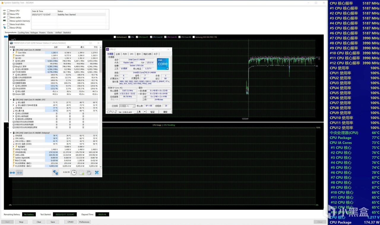測試部分,首先來看下溫度方面的表現。室內環境室溫爲23℃,溼度47%。先來看下CPU的滿載溫度表現:CPU默頻滿載大核心5.2G,小核心4.0G,處理器功耗175~178W之間,測試時長25min,AIDA64 FPU烤機CPU滿載溫度維持在66℃,核心溫度維持在77℃。