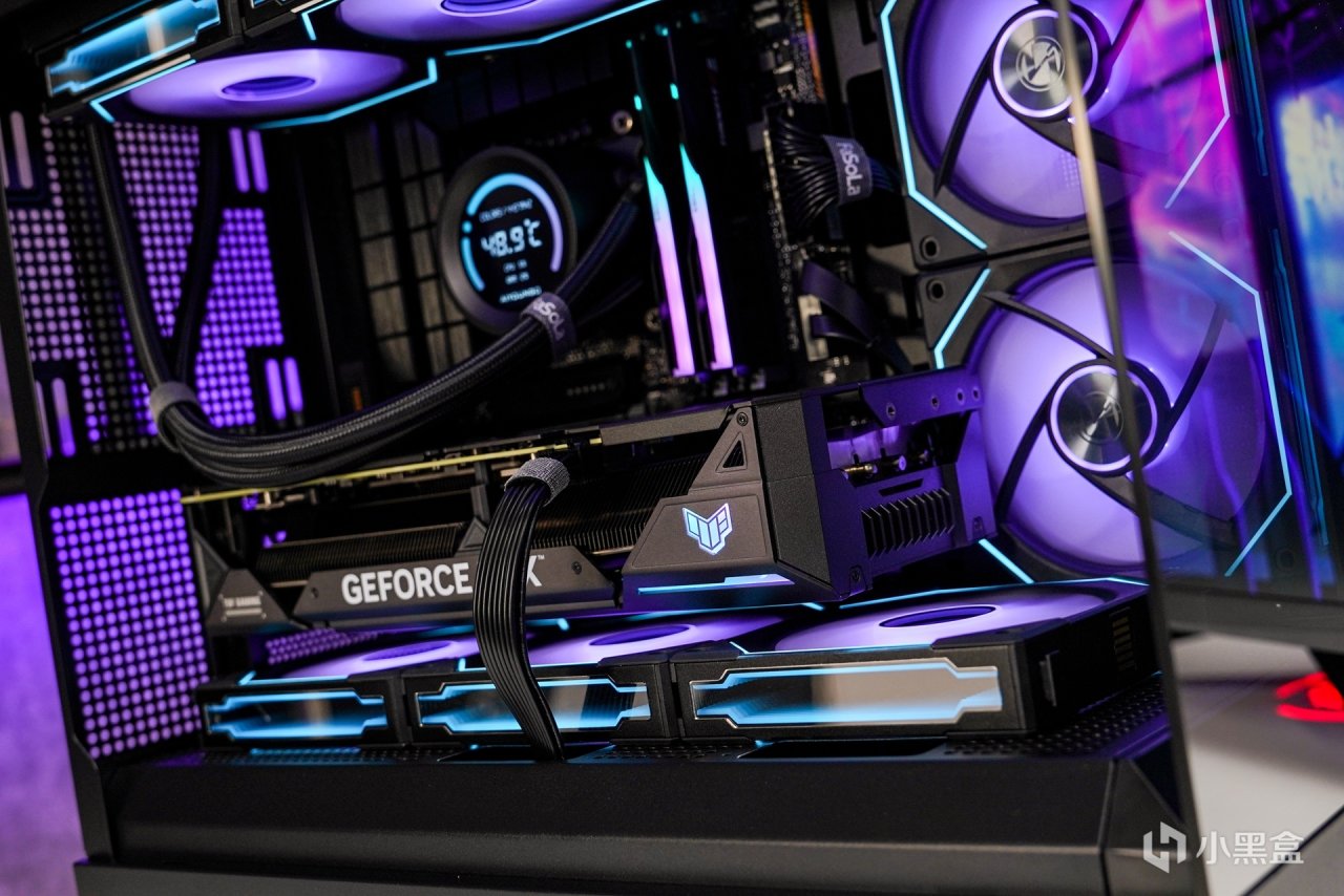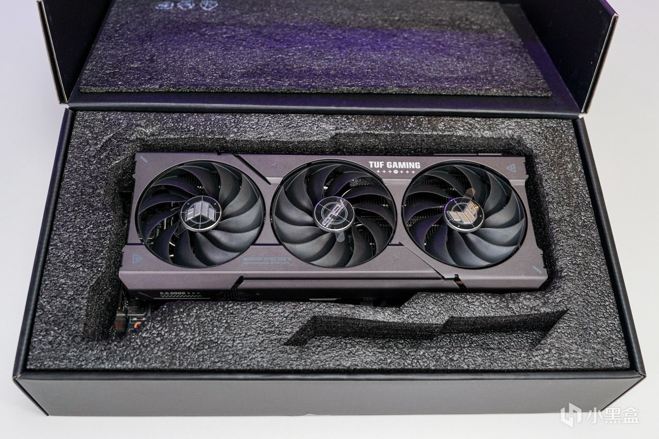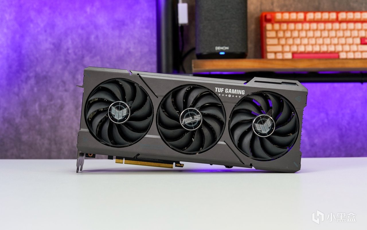 顯卡搭配上使用了這張--華碩TUF RTX 4070T O12G,保留了TUF軍規化的外觀設計風格,散熱馬甲全金屬材質打造,啞光黑配色,磨砂的質感,表面 TUF GAMING 英文名及華碩總部座標點綴。顯卡整體長度爲 305mm,顯卡正面搭配三個 Axial-tech 軸流風扇,支持全高阻隔環,能大幅提升靜壓,另中間風扇與兩側風扇爲正逆轉動設計,可以減少空氣亂流,提高散熱氣流利用率,並且支持低負載停轉技術,在低負載狀態下讓風扇進入更高效的降噪運行。