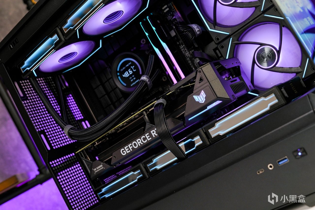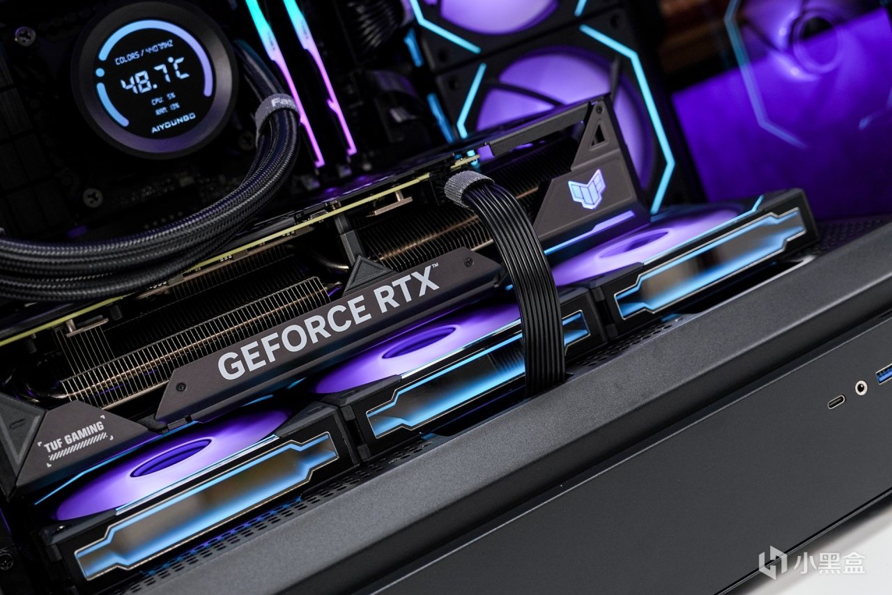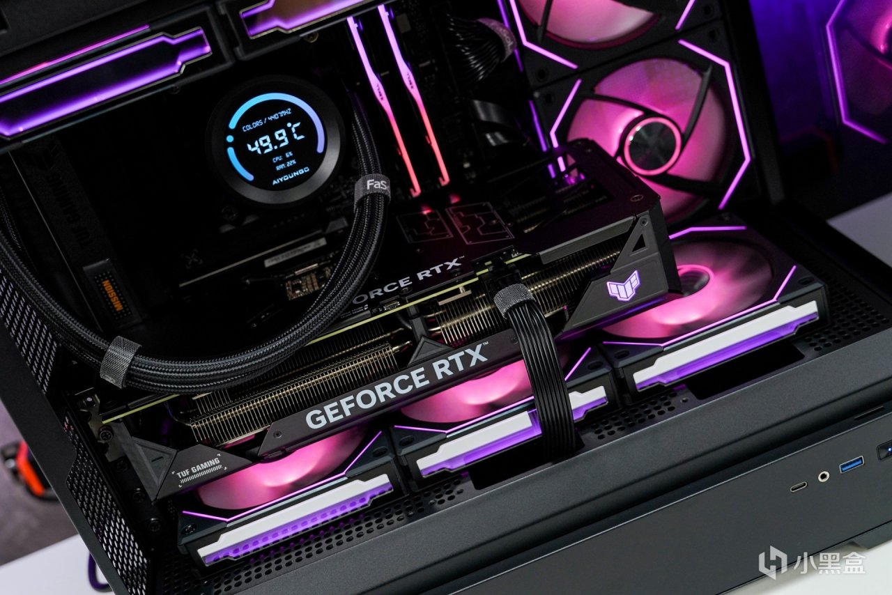 顯卡搭配上使用了這張--華碩TUF RTX 4070T O12G,保留了TUF軍規化的外觀設計風格,散熱馬甲全金屬材質打造,啞光黑配色,磨砂的質感,表面 TUF GAMING 英文名及華碩總部座標點綴。顯卡整體長度爲 305mm,顯卡正面搭配三個 Axial-tech 軸流風扇,支持全高阻隔環,能大幅提升靜壓,另中間風扇與兩側風扇爲正逆轉動設計,可以減少空氣亂流,提高散熱氣流利用率,並且支持低負載停轉技術,在低負載狀態下讓風扇進入更高效的降噪運行。