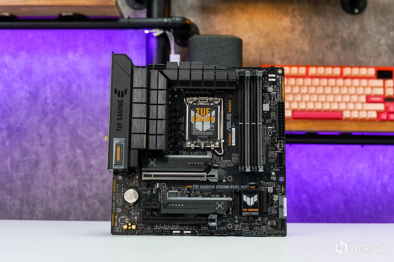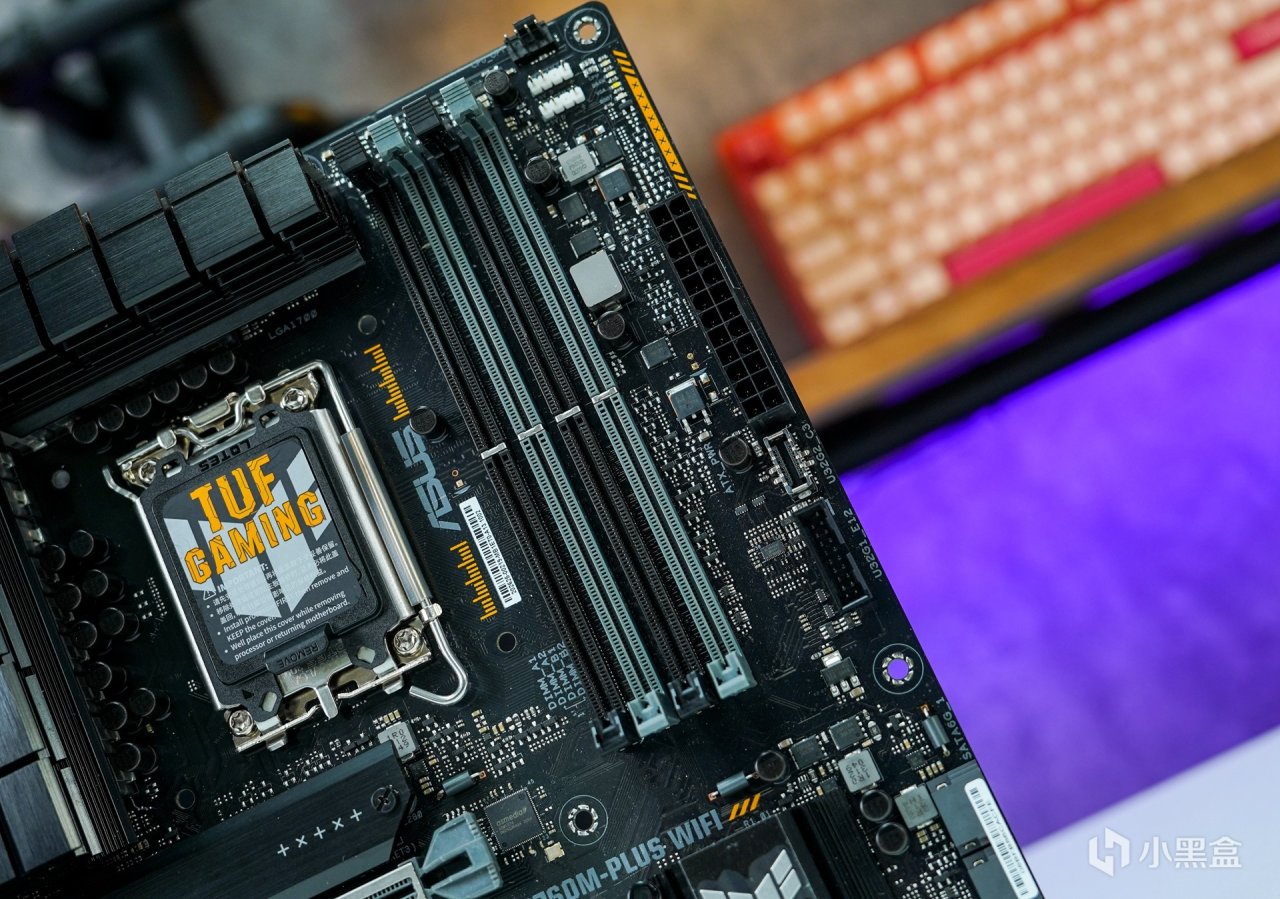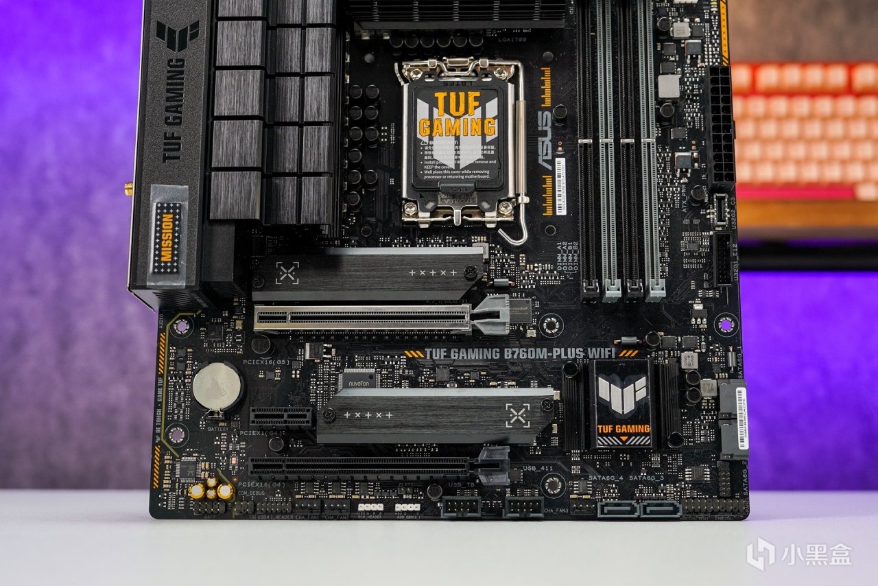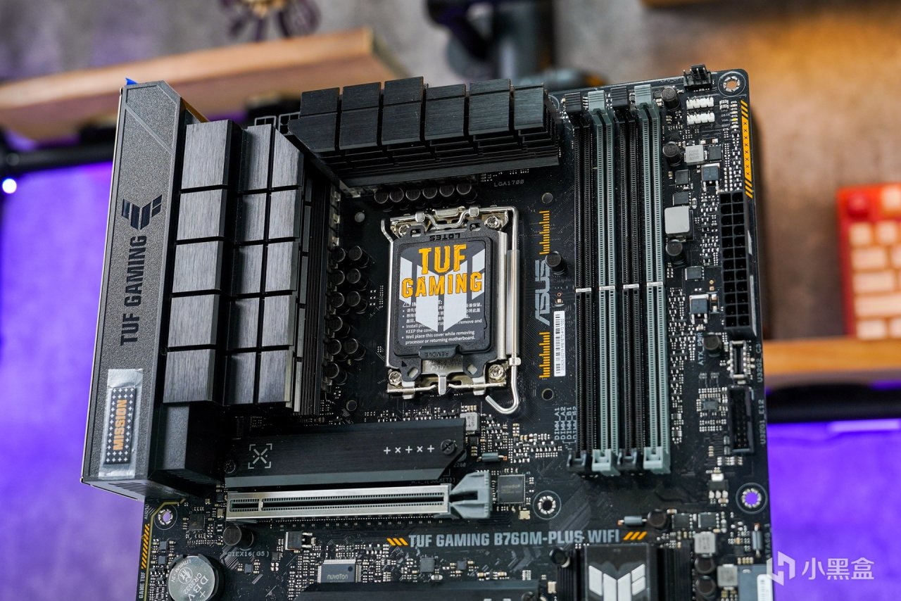 12/13代使用的主板是兼容14代處理器的,只需要升級主板BIOS即可。這次依然使用上現有的--華碩TUF B760M-PLUS WIFI 重炮手D5主板。外觀上承襲了TUF一貫主打的黑橙色調設計,供電部分採用12+1供電模組,Dr.MOS 60A,DIGI+VRM 數字供電控制, 8+4 Pin ProCool高強度供電接口。