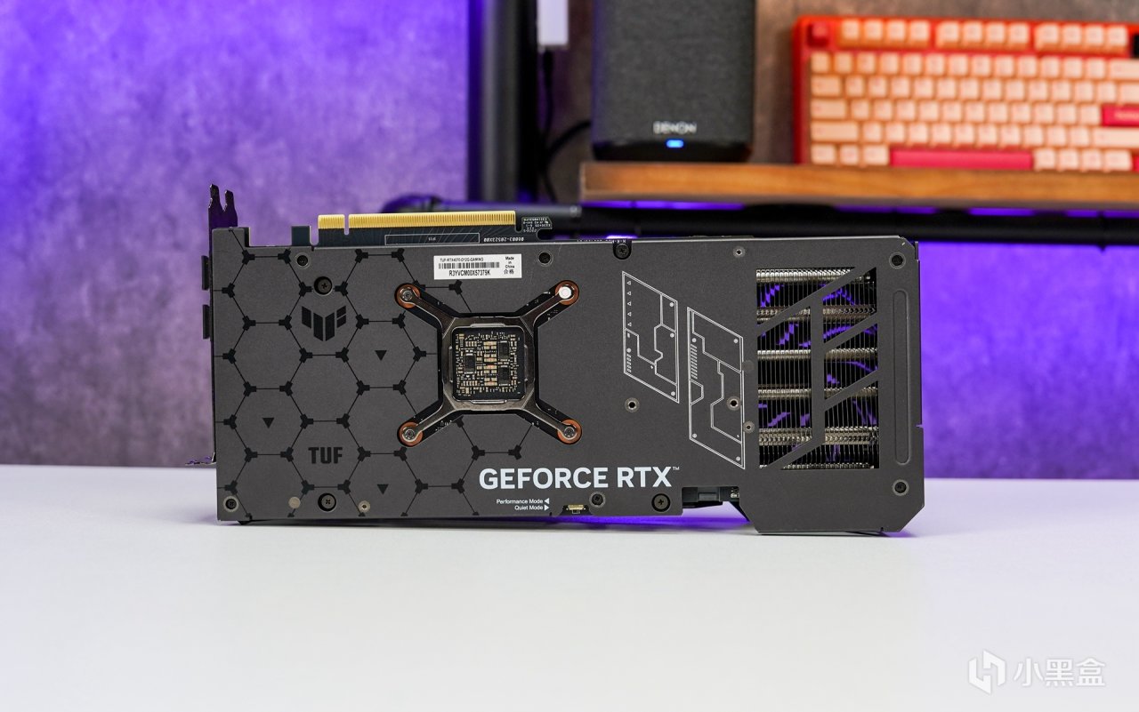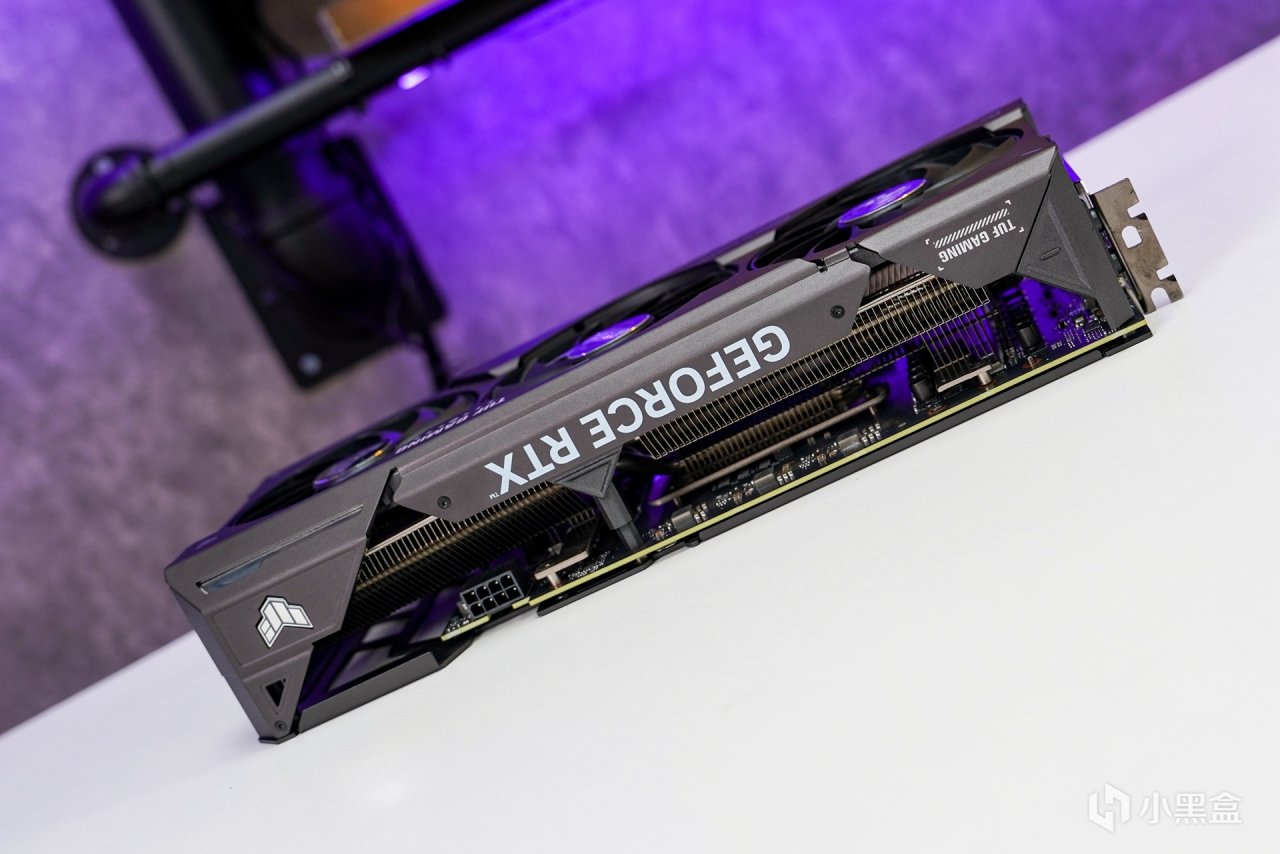 背面的金屬背板,也是採用和正面一樣的啞光黑配色+磨砂質感漆面,覆蓋型均熱面板上的 TUF 元素及相關圖形文字修飾,尾部大面積的鏤空,開孔樣式呼應表面圖案,形成一個 TUF 圖形 LOGO ,開孔可有效提升背面的散熱效率。顯卡採用的是上下均爲大面積的鰭片外露散熱設計,依然採用的是傳統的兩段式散熱模塊佈局。側面馬甲厚度約64mm,採用2.5槽位設計。