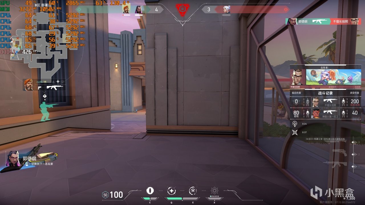 接着是無畏契約,2K高刷顯示器幀數維持在400FPS以上,CPU溫度最高維持在64~68℃,GPU溫度維持在49℃。