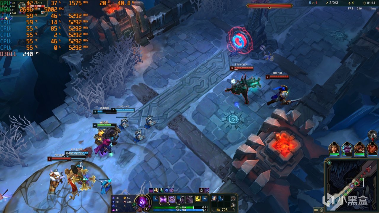 英雄聯盟---2K高刷顯示器鎖定幀數在240FPS,CPU溫度最高維持在55~59℃,GPU溫度維持在42℃。綜合上述幾款遊戲的表現,在2K 高刷顯示器下的表現都達到了預期的高幀數表現,溫度方面在室溫23~25℃下CPU和GPU的溫度表現都是可圈可點的,當然了這也和使用的散熱器和顯卡散熱器有着密不可分的聯繫。