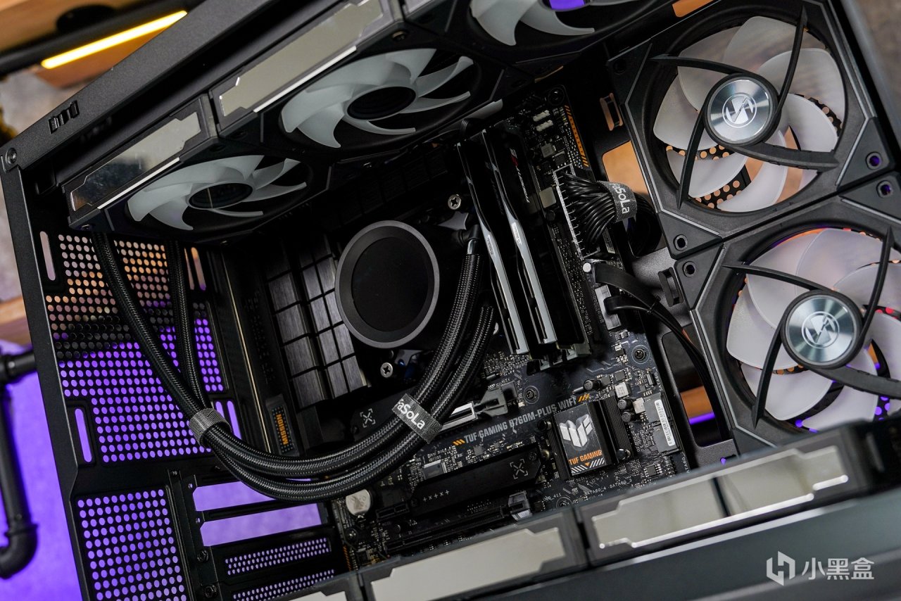 從內部安裝硬件可以看到:海景房機箱最大的優勢就是其便捷的安裝體驗,機箱內部的兼容上置可以兼容360MM水冷,側面和下置還有後置都是可以安裝散熱風扇的。上置冷排位是經過前移處理,所以並不會擋住CPU供電的安裝,冷排裏面的縱深位置是充足的,就算是一些較粗的定製線都是可以輕鬆安裝的。
