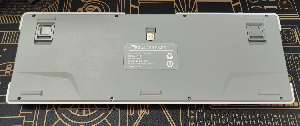 翻到底部,同样极简风格的灰色,一对两段式脚撑、边角共五个硅胶脚垫,2.4G接收器的槽口其实在侧面会更方便拿一点。但由于青龙3.0的外壳并不是常见的上下拼接设计,而是用上盖盖住了底部,所以也就只能把接收器的凹槽放到底部了,凹槽带磁吸效果,收纳的可靠性还是不错的