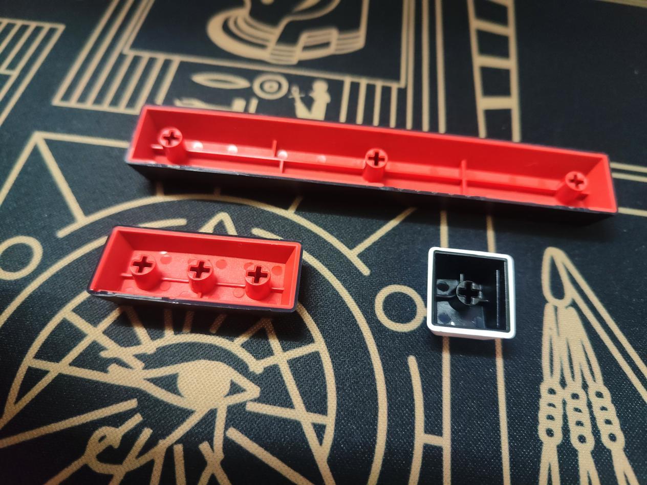 键帽做工在这个价位属于很不错的水准,双色注塑PBT,厚度上没有偷工减料,边缘平整,精度也足够,安到轴体上的时候不会有过紧或过松的感觉