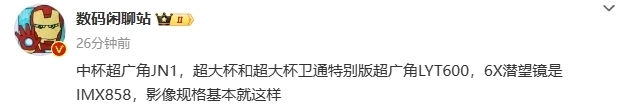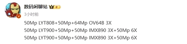 ◇ 后置:50MP超大底主摄(LYT900,IMX989升级版)+50MP超广角(首发LYT600)+50MP大底人像潜望长焦(IMX890,3X±)+50MP小底潜望超长焦(IMX858,6X±),双潜望方案;