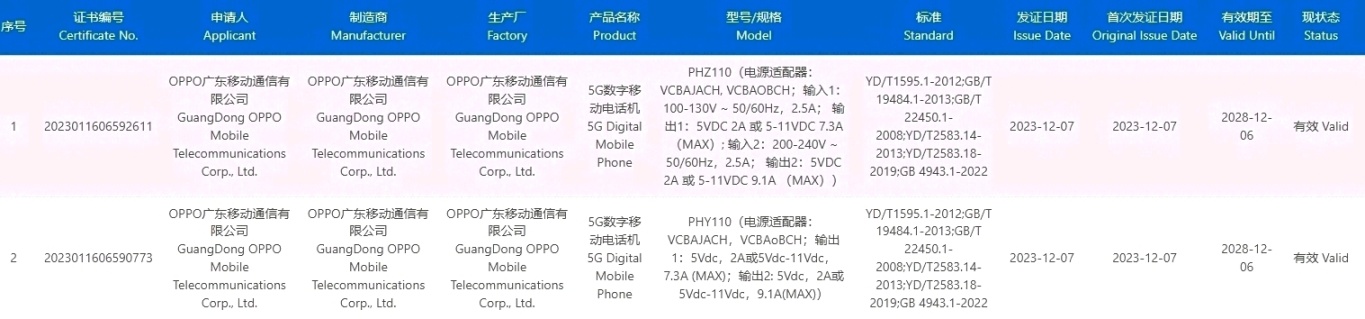 ◆ OPPO Find X7 系列,两款机型通过了国家 3C 认证,型号分别为 PHZ110 和 PHY110。