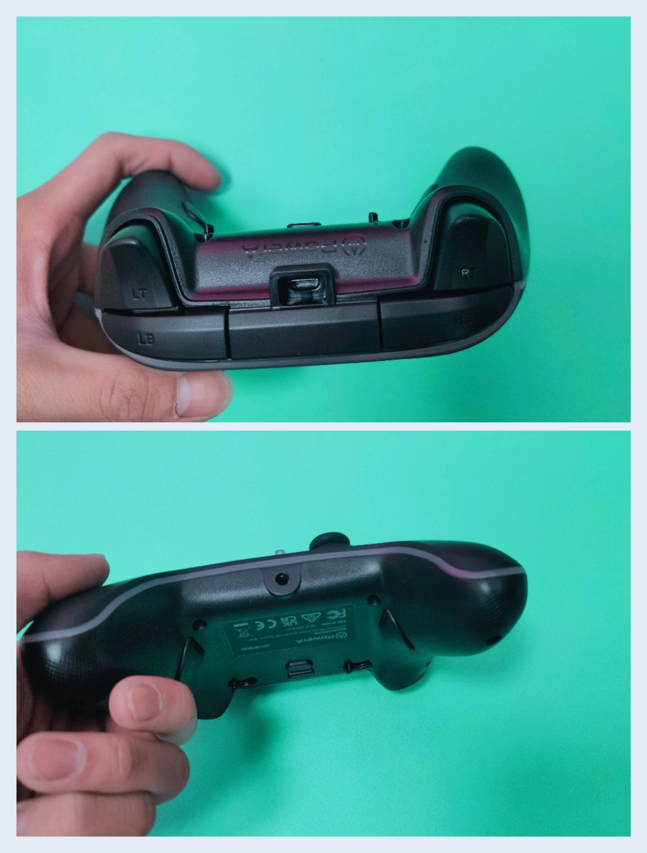 模具方面延续了之前POWERA手柄的外观,上侧的两个肩键十分平整,轻触起来十分舒服,并且还有个连接接口,值得一提的是他这个线足足3m长,想来也是因为没有微软的无线授权嘛!但是有不少人又是在客厅玩xbox主机,为了让他们能够更加舒适地玩耍,也只能将线做的极长了,也算是挺人性化的,手柄的底部呢为3.5mm耳机接口。