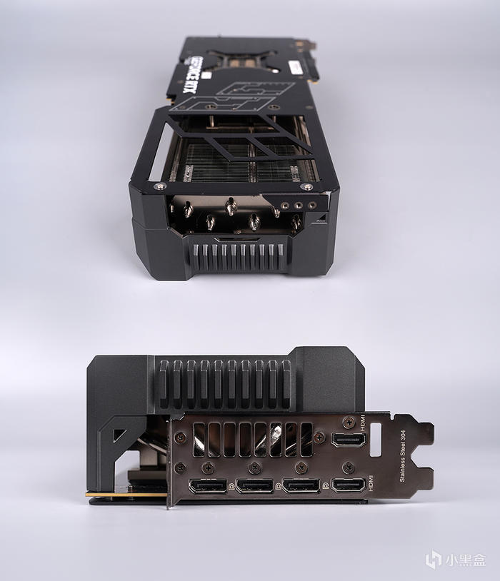 实际 PCB 比散热器短上好大一截,前置镂空外露出大面积的散热鳍片,通过贯穿式风流增强散热,这样更易于快速的带走热量,开孔样式呼应表面图案,形成一个 TUF 图形 LOGO 。整卡厚度约占 3.5 个 PCI 卡槽,依旧采用的是双 PCI 挡板设计(易于安装盒兼容),材质为 304 不锈钢( 具备抗氧化,保持美观 ),输出接口提供了三个 DP1.4a 和两个 HDMI 2.1 接口 ,相比公版多增加了一个 HDMI 2.1 接口。