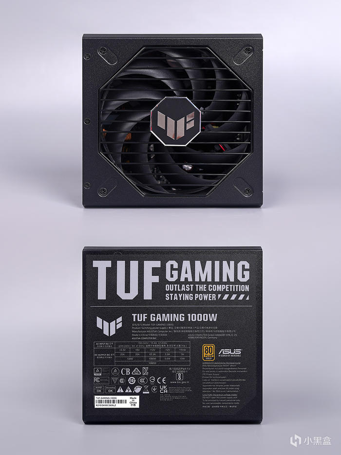 风扇位置,采用八边形镂空设计,对应形状的钢丝风扇罩及轴心 TUF 装饰标志,风扇采用 135mm 双滚珠轴承的轴流风扇,有着更好的散热及静音表现,另值得一提的是内 PCB 采用保护性涂层设计,更具耐用性,不惧潮湿天气,还有小强乱入,对应另一面规格贴标,80PLUS 金牌认证,+5V 和 +3.3V 输出电流 25A,合计输出 130W,+12V 输出电流 83.3.8A,提供最大 1000W 的功率,其它方面,带有 OPP/OVP/UVP/SCP/OCP/OTP 保护功能,采用低 ESR 日系电容可提升效率并减少发热源,降低噪音以及提高可靠性与稳定性,另获得了 iST 宜特检测实验室多项测试认证。
