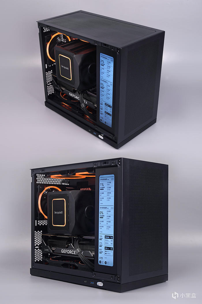 为此配备了一个侧置的副屏,亦充当前置电源的遮挡板,副屏采用 1920*480 分辨率,具有高度的可玩性,搭载有定制的驱动软件,可以自定义显示各种信息。另值得一提也就是这款低功耗副屏只需通过一条 USB 2.0 线连接主板,无需额外视频信号线及供电线。