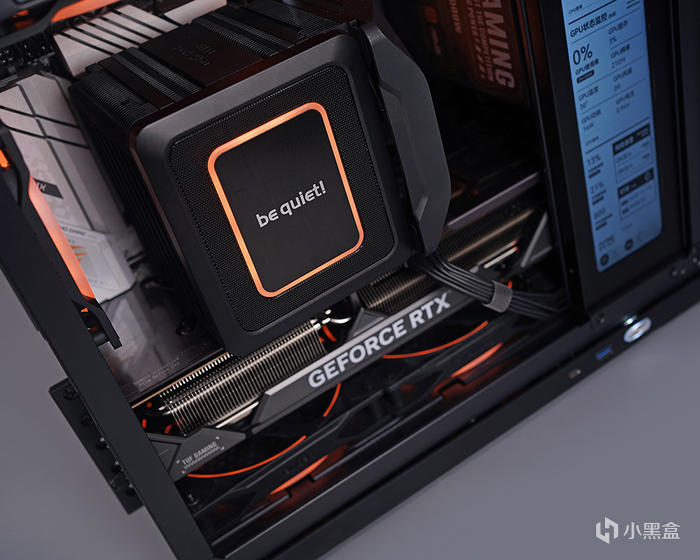 DARK ROCK ELITE 这款散热器有着独特的外观设计,整体采用一体式设计,方正造型结合圆润的倒角,顶部对应其造型的 ARGB 灯带,外圈金属网面修饰,居中 bequiet! LOGO 点缀,整体的外观形似于汽车发动机核心部件的既视感。