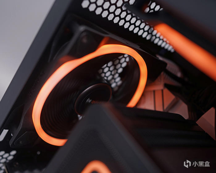 机箱风扇也选用德商德静界 be quiet! Light Wings 120mm PWM 高速版 ARGB 风扇, be quiet! 独有专利设计的水波纹,搭配双面 ARGB 光圈灯效,给到主机展现出比较不一样的灯光效果。采用高品质 Rifle 轴承,PWM 智能温控调速,最高转速可达 2500RPM。