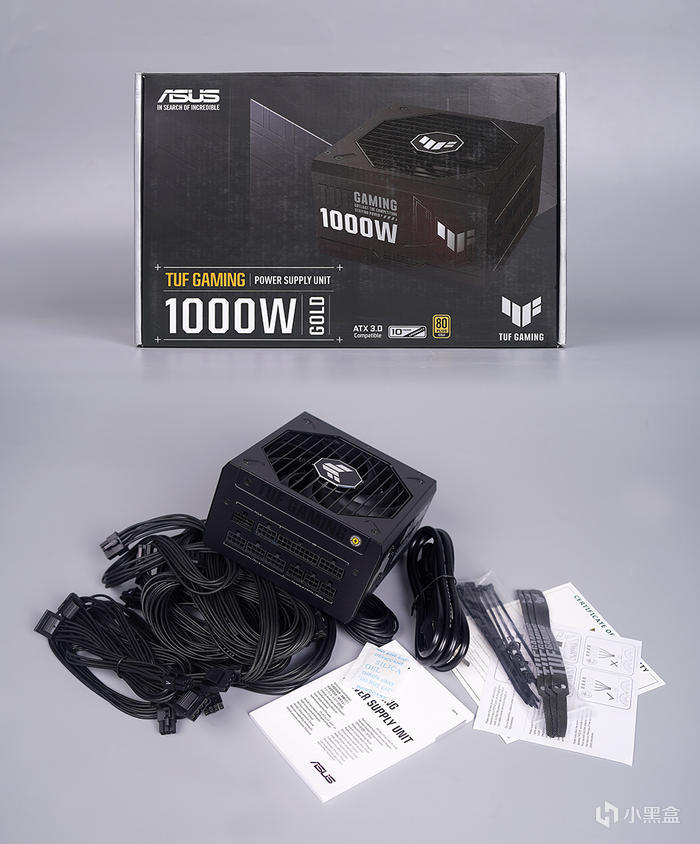 华硕 TUF GAMING ATX 3.0 1000W 金牌全模组电源,包装正面电源渲染图示意,标注采用 ATX 3.0 设计、具备 10 年的质保时间 、80 PLUS 金牌认证等。电源搭配黑色压纹包网模组线,质感相当的不错,材质相比普通模组线也来得更软一些,更好的走线,更加的美观,基本可以省去后做定制线的钱了。