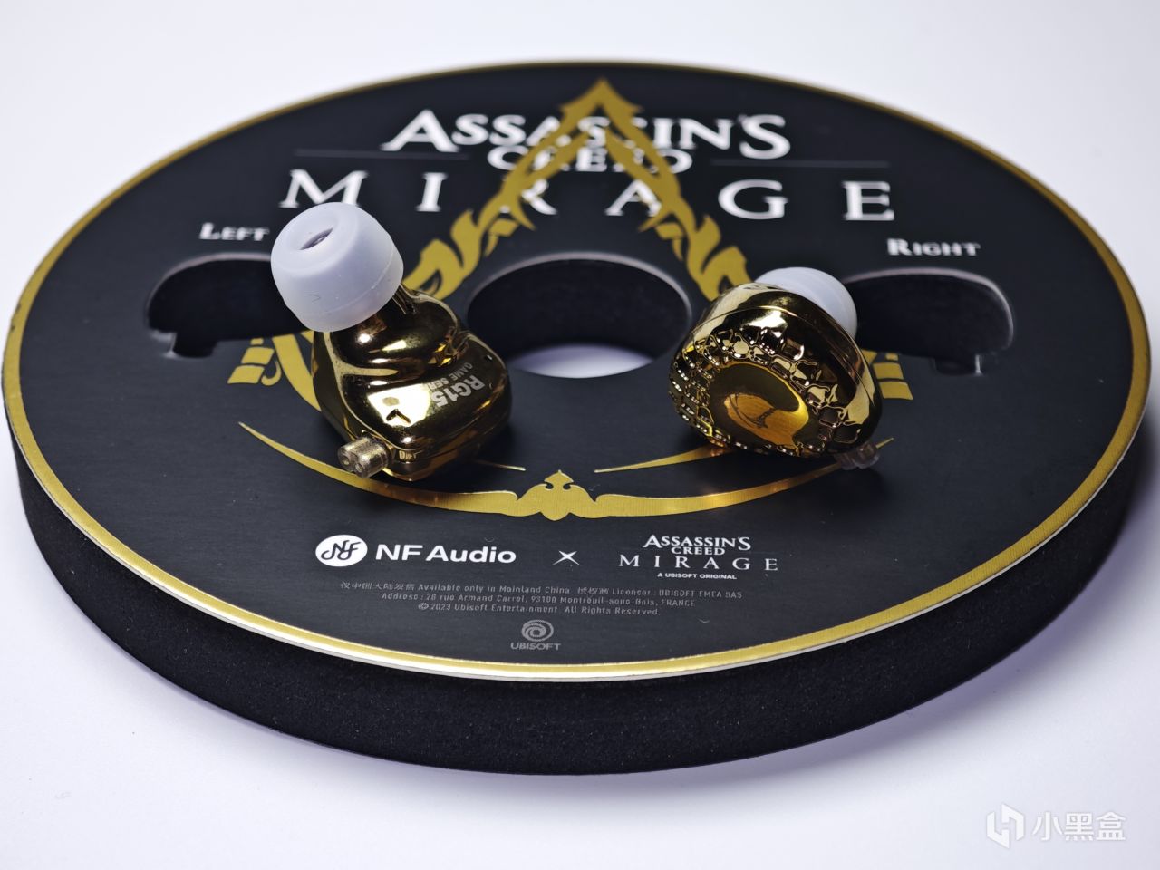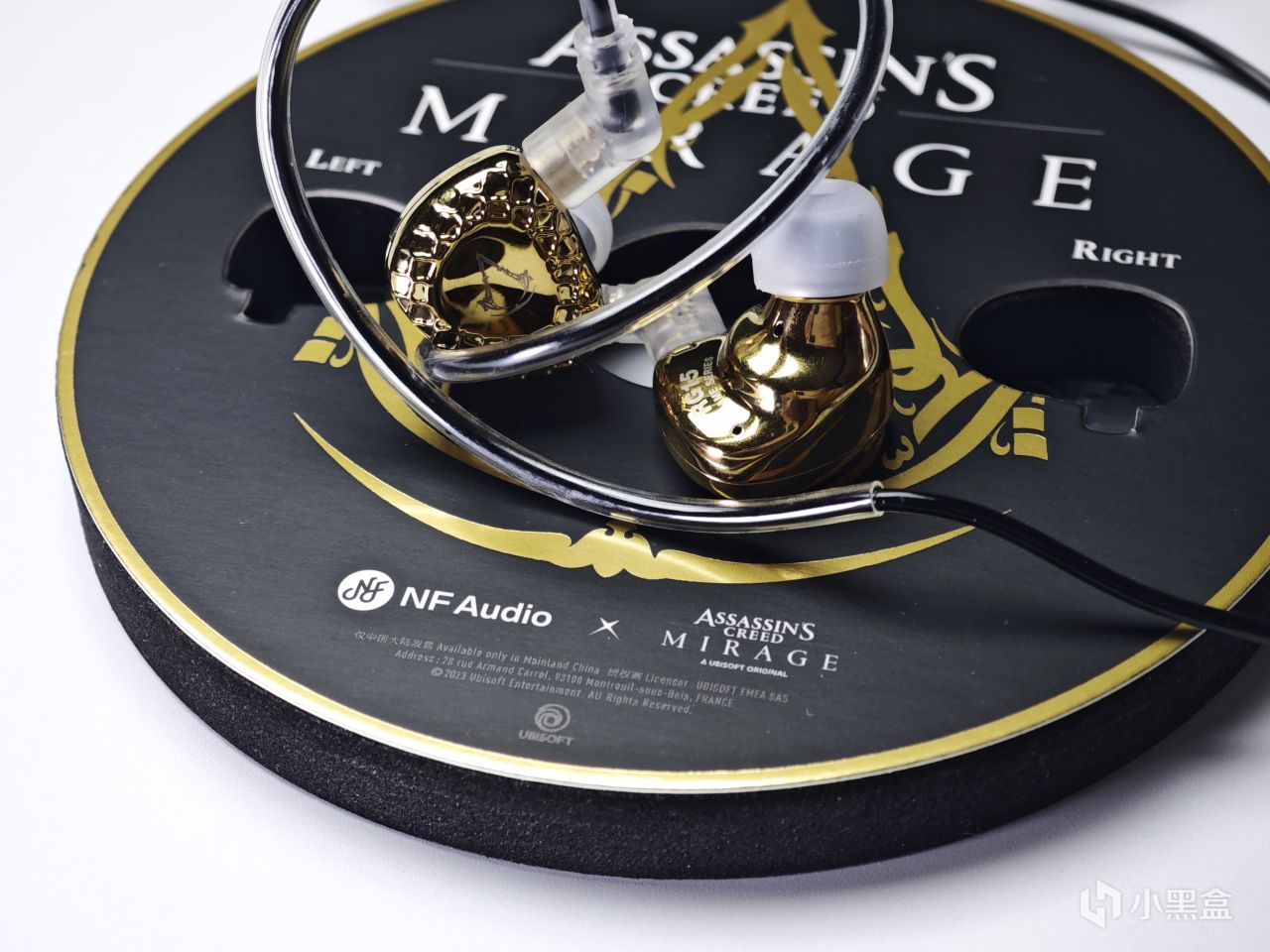 包装上最显眼的并不是耳机的图或是名字,反而是这次联名的重点,也就是《刺客信条 幻景》的游戏封面,占据了盒子的大部分地方,但并不代表耳机的型号就不显眼,可以看到位于盒子的左下角位置,同时采用烫金工艺,在其下方是一些补充,还能看到联名的标识。