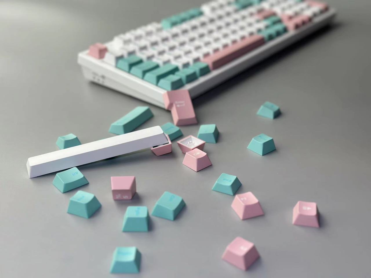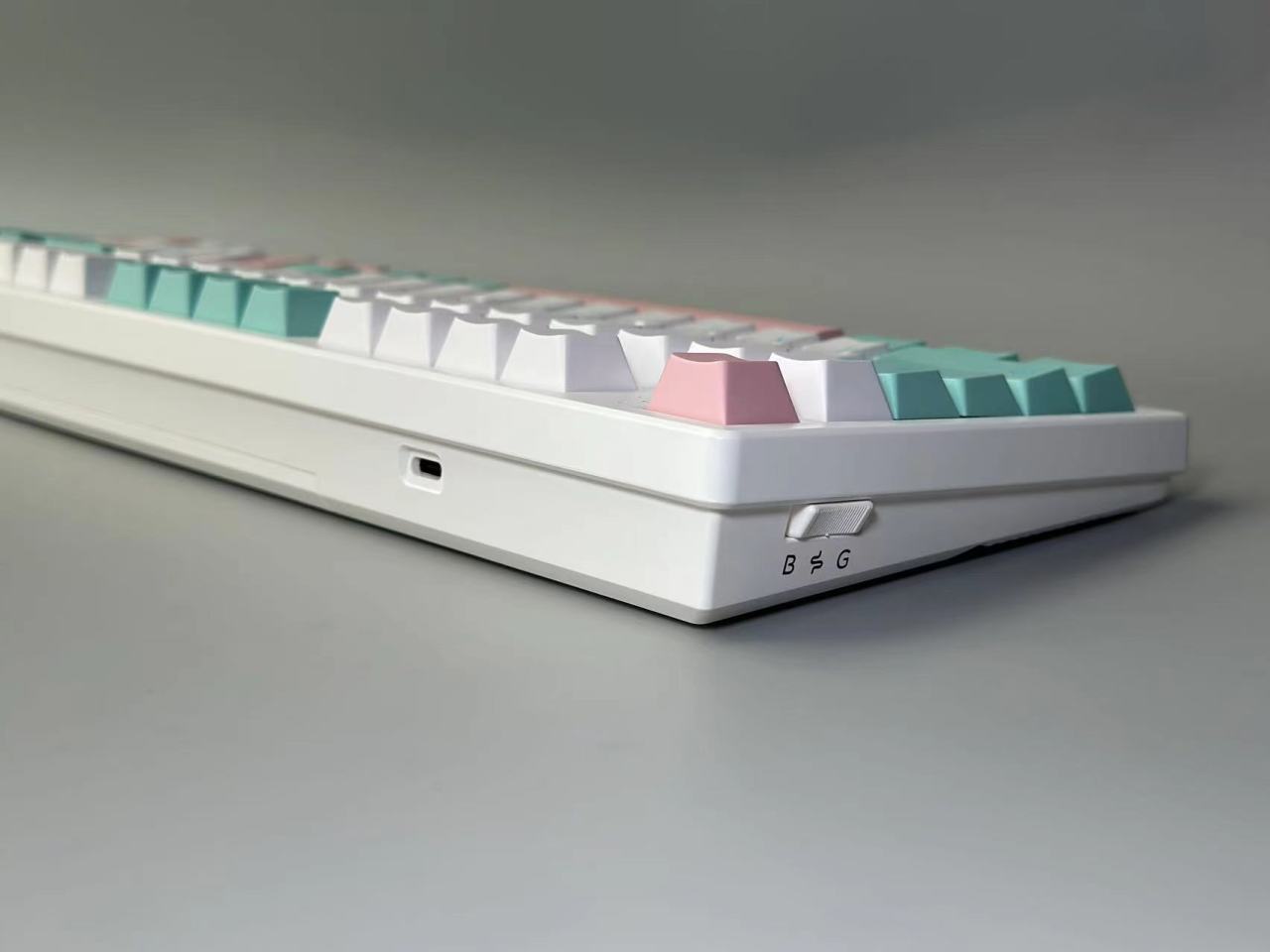 XS98T的键帽采用双色PBT材质,高度为原厂高度。整个键盘的键帽配色也是选用了目前比较受欢迎的青粉白三拼色。键帽整体的做工细节也是挺不错的,手感也比较细腻。