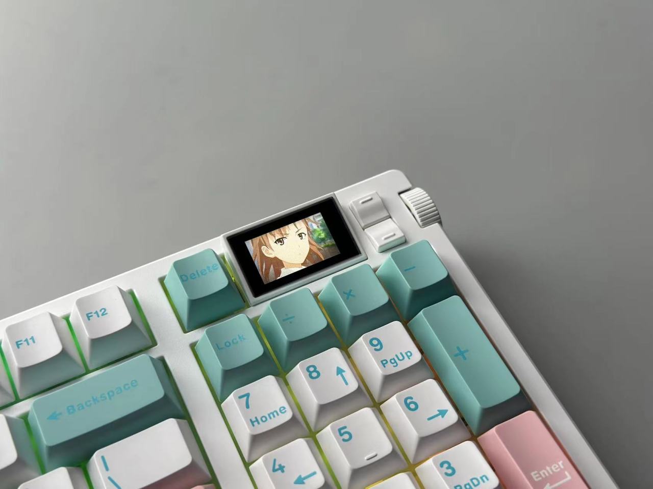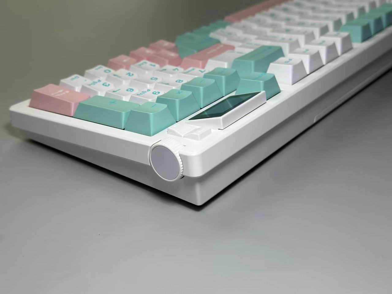 XS98T的右上角是这把键盘的亮点之一,屏幕位置设置在了PU和DN这两快捷键上了,但是呢XS96T这次在右侧位置采用了两颗微动还代替了PU和DN的快捷键。而滚轮则是设计在了侧面。