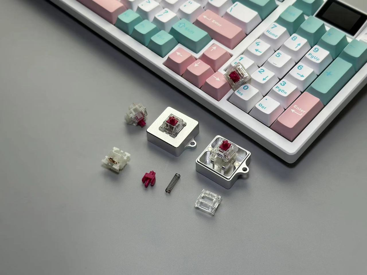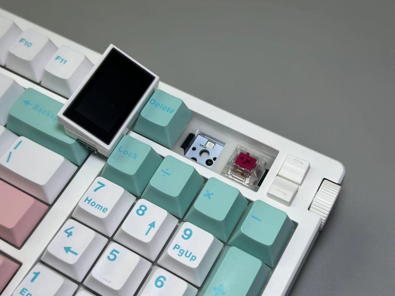 XS98T采用的是目前比较流行的98%配列,但是目前98配列带屏幕的不同是,XS98T的屏幕是选择了模块化处理,当你不想要屏幕时可以把屏幕拆下换为正常的轴体。
