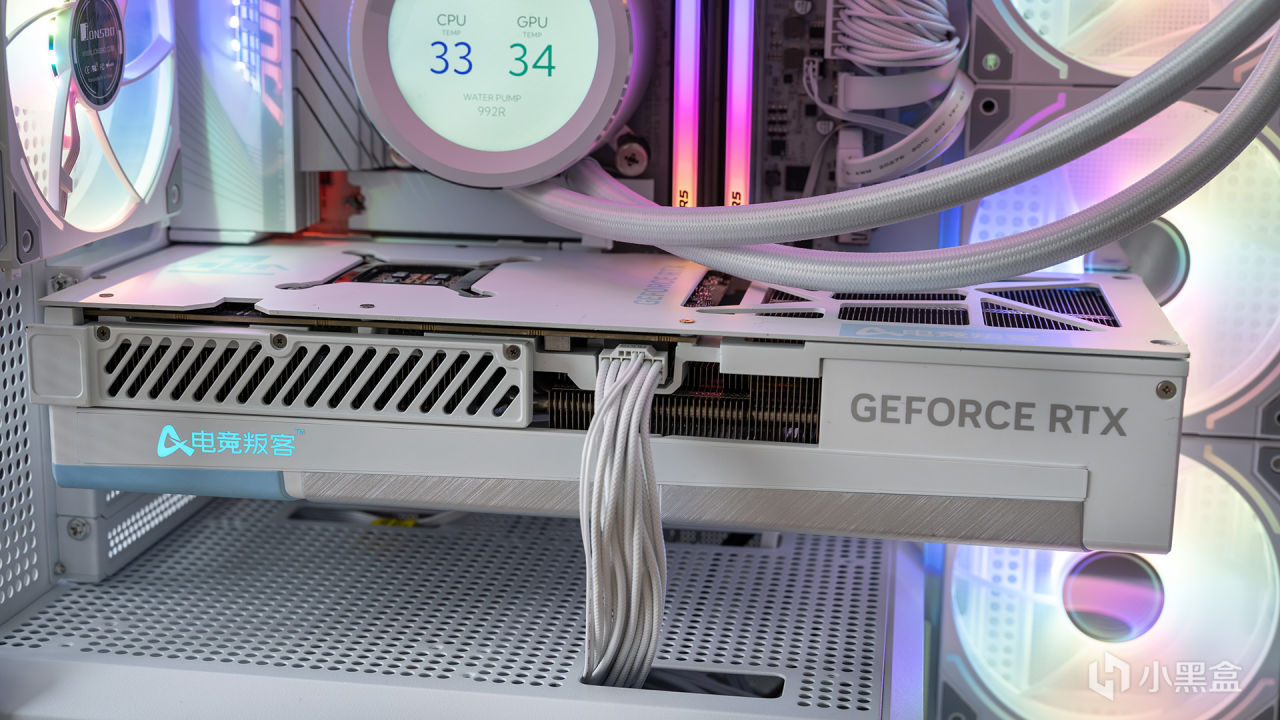 显卡来自AX电竞叛客RTX4090 X3W,目前也是绝版了,整体规模达到了337mm+三槽厚度,在这款紧凑MATX无立柱海景房中却显得一点不拥挤,机箱还贴心为12VHPWR 16pin线材镂空了位置,走线会更美观和流畅。