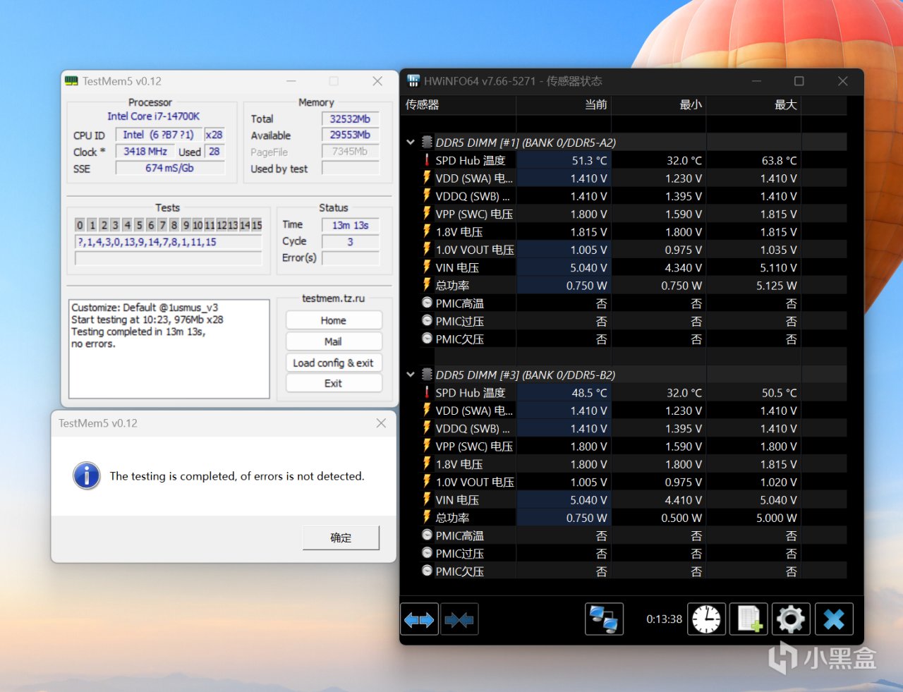 技嘉D5黑科技是一种对新手友好提升内存性能的手段,并且稳定度非常高,D5黑科技开启后,Vesta II RGB DDR5 6600这套内存在B760M冰雕X上是能完美通过TestMen5烤机测试,不需要担心后续使用出现死机、重启的情况,另外烤机过程内存温度表现也很不错,在封箱无风扇辅助情况下,两根内存最高温度均稳定在50℃左右。