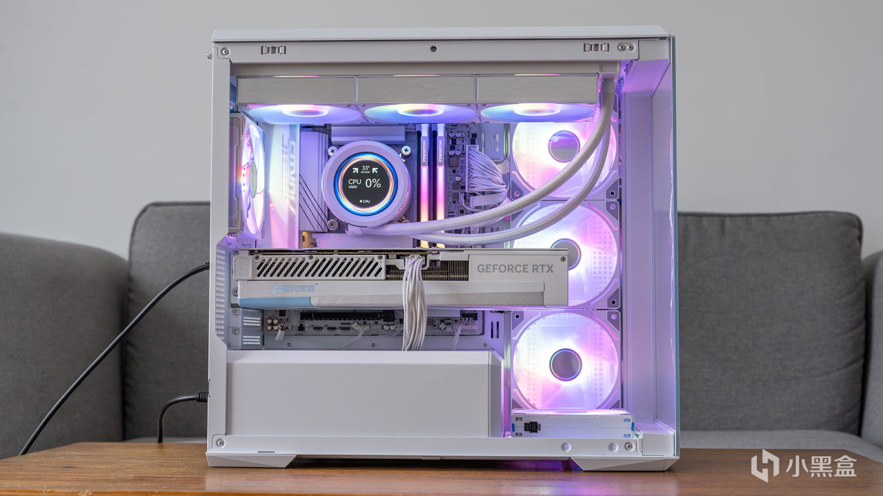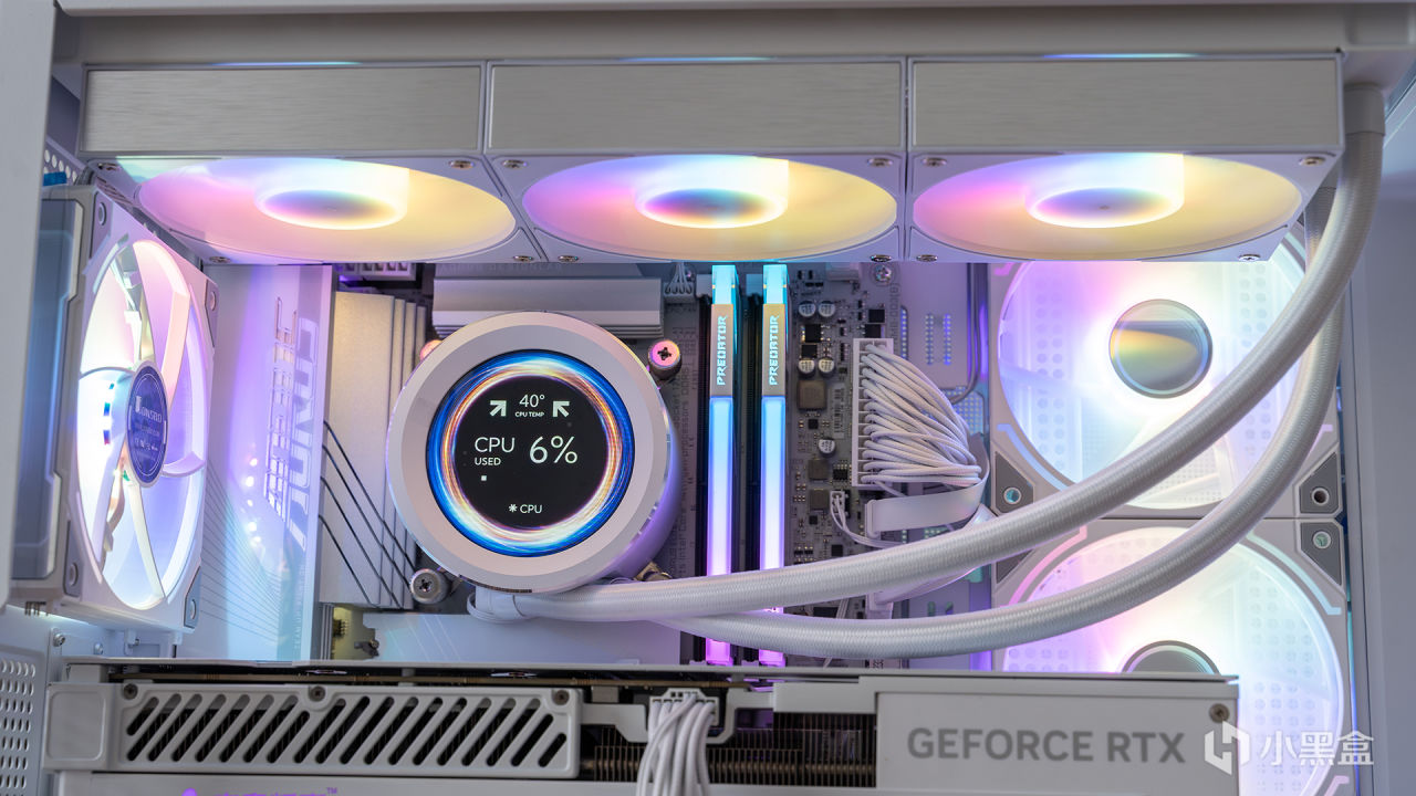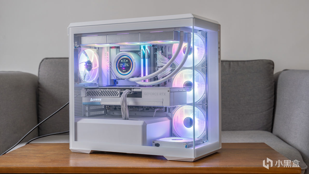 装机过程省略一万字,插电一次点亮不翻车,事实证明无立柱海景房为什么会流行起来——机箱内部得以无死角充分展示,并且全员纯白硬件配合ARGB灯光把氛围感也拉满了,要是纯黑主题,那还是无光比较适合,可以突出冷酷的风格。