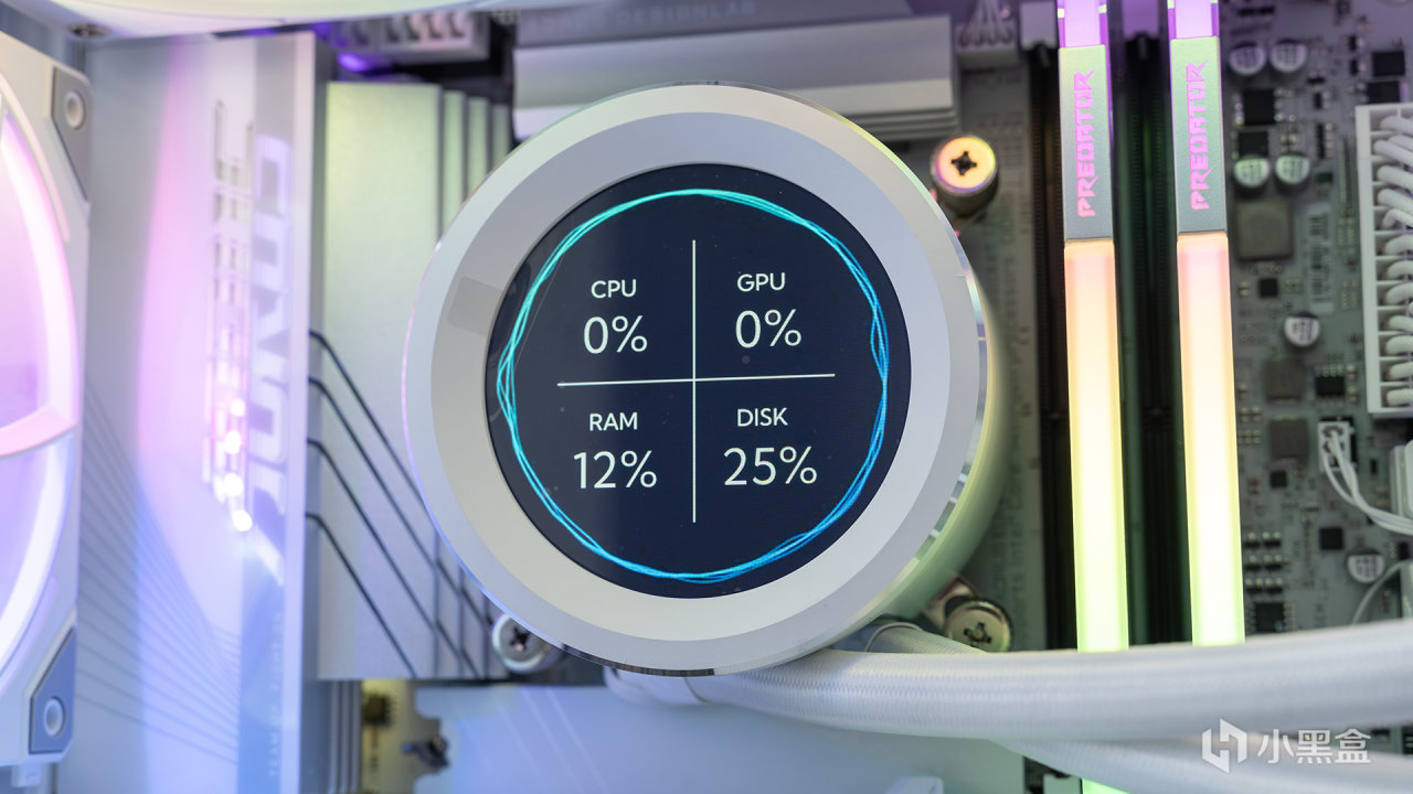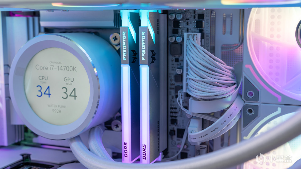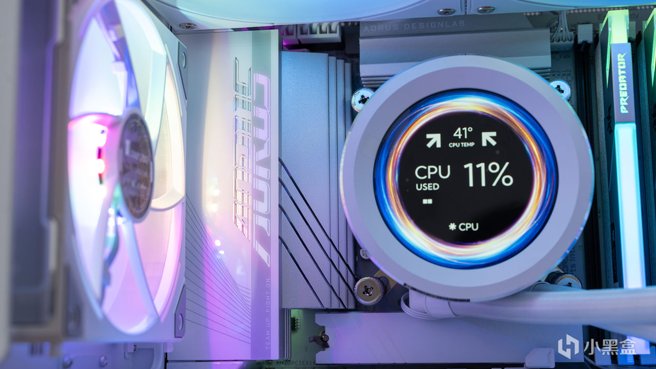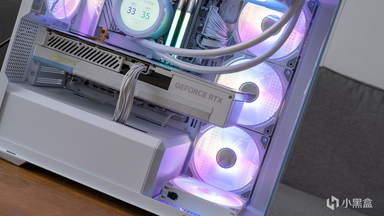 装机过程省略一万字,插电一次点亮不翻车,事实证明无立柱海景房为什么会流行起来——机箱内部得以无死角充分展示,并且全员纯白硬件配合ARGB灯光把氛围感也拉满了,要是纯黑主题,那还是无光比较适合,可以突出冷酷的风格。
