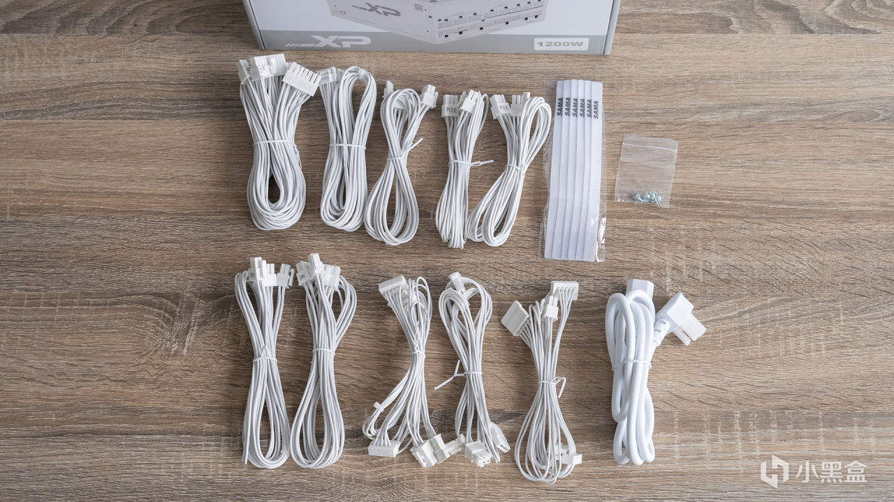 全模组线材和配件,每一根均采用柔软特性的压纹线设计,具体线材方面,提供了1*24pin供电、2*(4+4)pin CPU供电、3*(6+2)pin显卡传统供电、1*12VHPWR 16pin PCIe 5.0新标准、2*SATA(每根4个)、以及1*大4D(每根4个)这些类型,能满足现今及未来的高端配置。