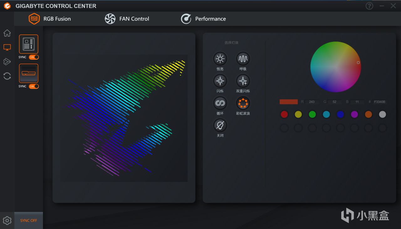 整机可通过GIGABYTE CONTROL CENTER(简称GCC)软件控制ARGB灯效,界面UI设计相当简洁,默认提供了6种灯效可选,个人最喜欢就是彩虹或者单色恒亮。
