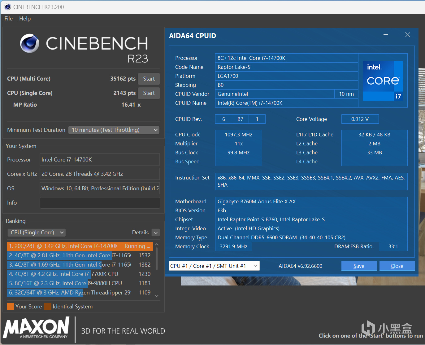 CINEBENCH R23十分钟循环多核跑分结果是35162 pts,和单次跑分完全一致,比上一代13700K多出来的四个E核心是领先关键,就分数而已其实和更高端的Z790主板表现是没区别的,而单核跑分为2143 pts,睿频比13700K要高,自然分数也高一点。