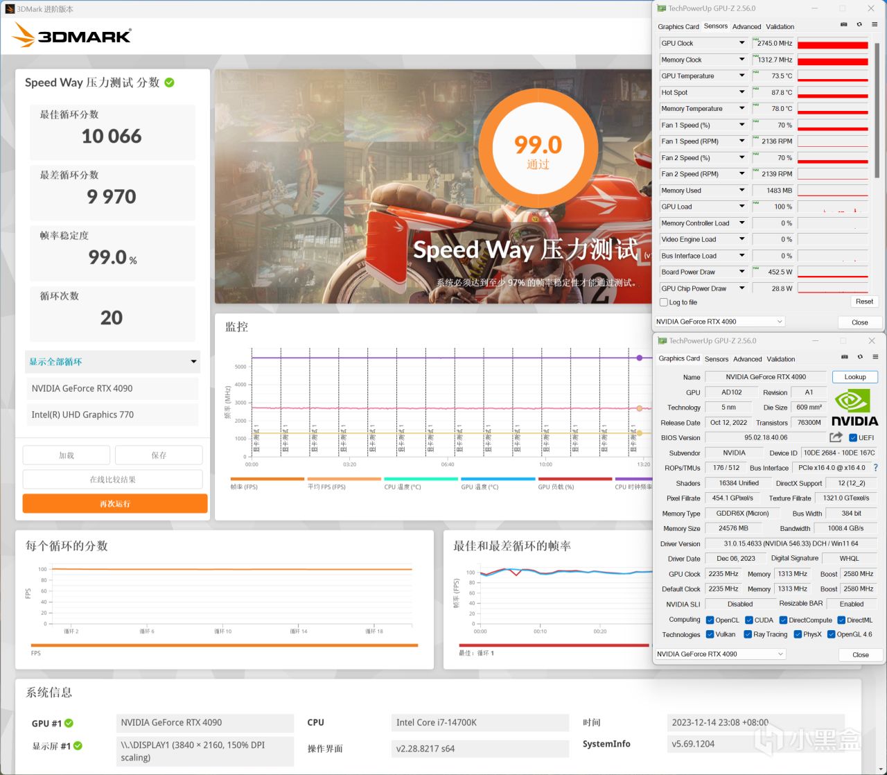 最后使用3DMark Speed Way压力测试对RTX 4090进行烤机测试,最终是以99%的稳定度通过,最佳和最差循环分数相当接近,显卡最高温度仅有73.5℃,这可是450W功耗的GPU,而显存温度也压制在78℃,首先当然得归功于显卡的强大散热规格,也少不了机箱良好风道的搭建。