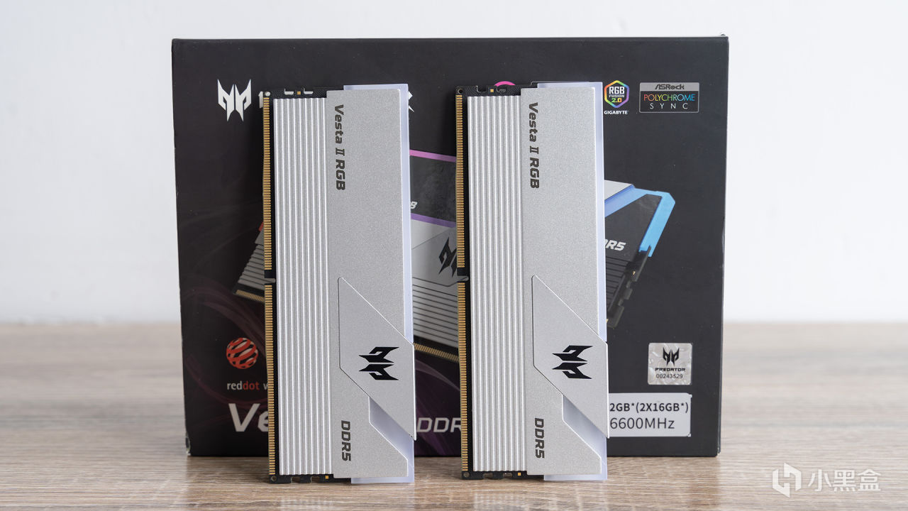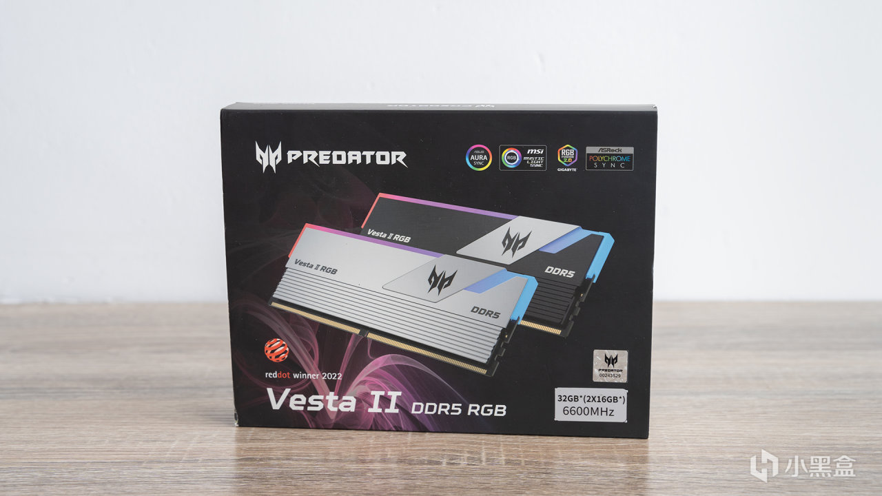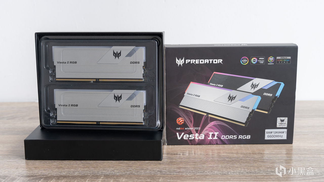 主板内存性能这么强,内存条自然也要选择高端的才好匹配,敲定宏碁掠夺者这款Vesta II RGB DDR5 6600 16GB*2套装,中文命名为炫光星舰,从包装上能看到,这款内存还曾获得2022年红点奖的荣誉,它是一款高性能RGB灯条。