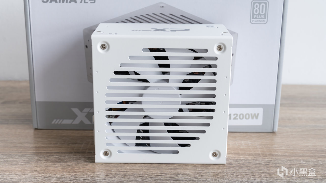 XP1200 V3雪装版整体尺寸为150*150*86mm,在1200W电源产品中算是非常紧凑了,完全可以适用于大部分紧凑MATX机箱中。电源内置了一颗140mm FDB液态动压轴承风扇,光看尺寸就知道散热性能已经拉满,风扇还支持ECO模式,属于温度、负载双控制策略。