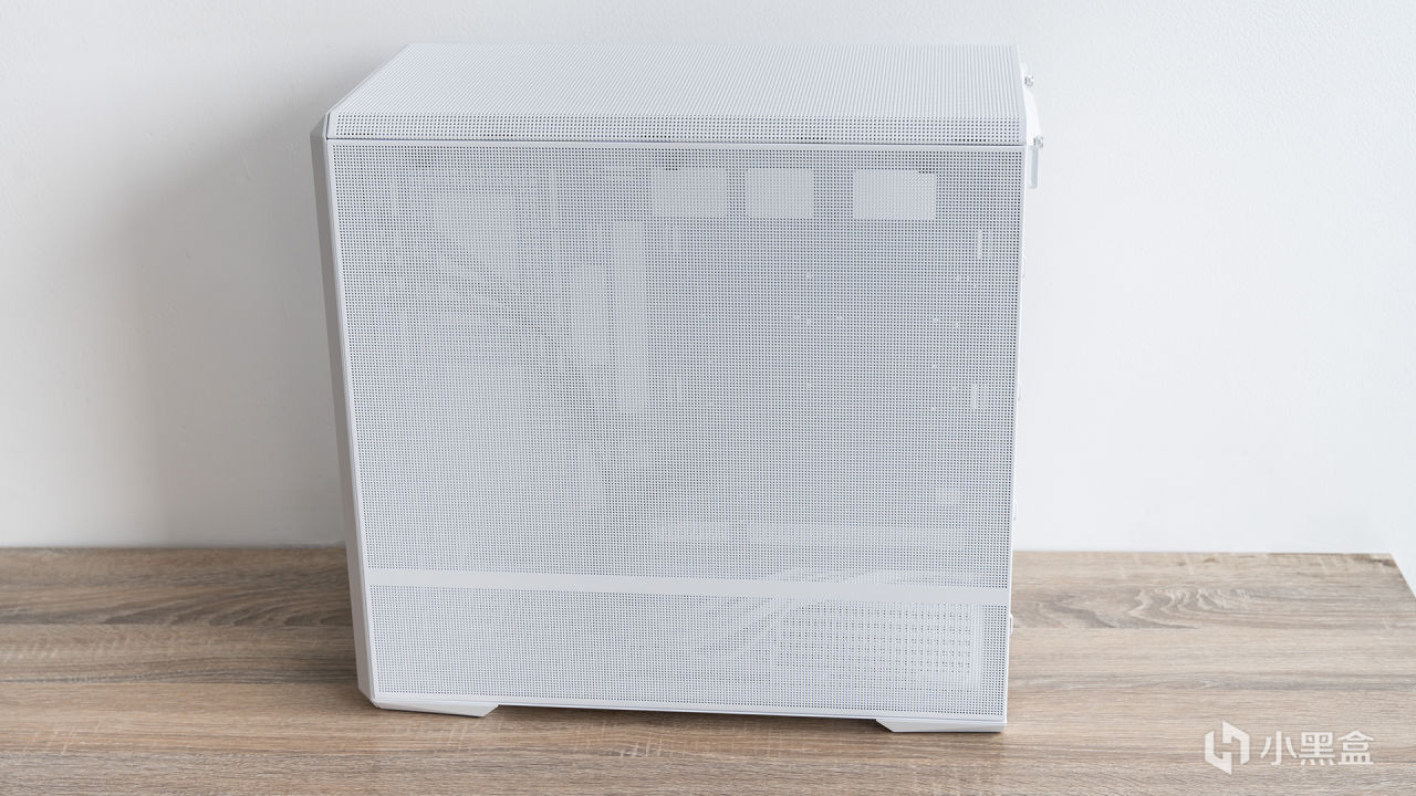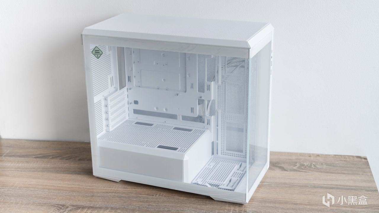 机箱的三块面板均采用免工具拆卸,装机非常便利。拆卸后,我们可以简单分析一下机箱的结构,和以往传统的侧透机箱不一样的是,这款机箱不仅拥有广阔的硬件可视范围,而且散热风道是极其合理的——摒弃前置风扇/水冷支持,砍掉电源仓一部分,以便腾出空间可以安装下置和侧置风扇(吸进冷空气),不变的是顶部依然是360水冷安装位和尾部是排气风扇位(排出热空气)