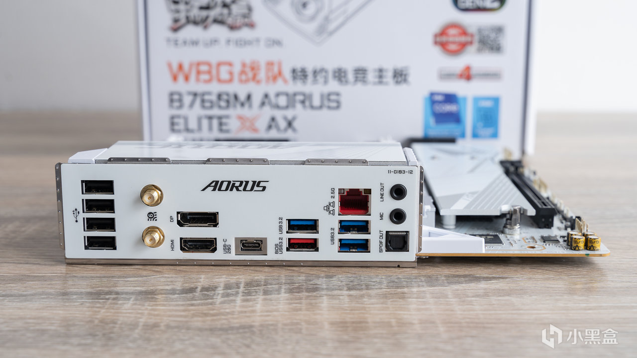 主板I/O拥有4*USB 2.0、Wi-Fi 6E无线网络、1*HDMI、1*DP、1*USB 3.2 Gen 2x2 Type-C、1*USB 3.2 GEN 2 Type-A(红色)、3* USB 3.2 GEN 1 Type-A、2.5G网口以及ALC 897音频芯片驱动的接口(带数字光纤输出)这些丰富配置,足以满足主流玩家的I/O扩展需求。