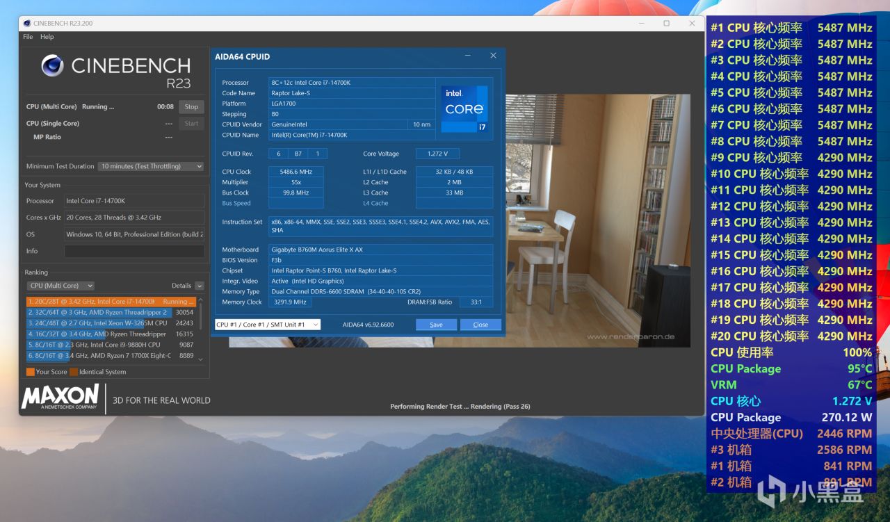 首先就对CPU进行CINEBENCH R23十分钟多核循环烤机项目,经过104微码降压后,CPU核心电压控制在1.272V左右,CPU Package功耗为270W,CPU温度压制在95℃,先马XW360W PLUS可以完美释放14700K所有的性能,大核和小核均正常睿频状态,主板VRM温度也只有67℃,说明主板用料足够扎实,另外机箱风道的良好搭建也会起作用。