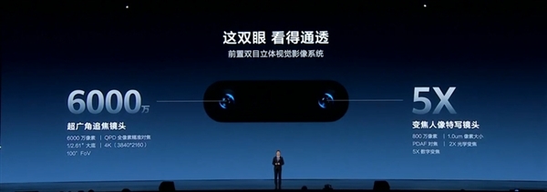 前置双摄分别为6000万像素超广角追焦镜头+800万像素变焦人像特写镜头,0.7倍-5倍全焦段覆盖,支持全新的XD Portrait达芬奇人像引擎,推出原生、质感、妆感三种美颜效果,让自拍美颜更自然、真实,保留原有的特征风格。