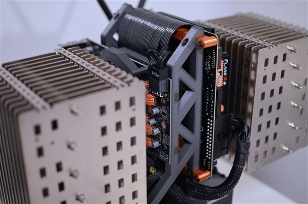 他以电源为基底,将处理器、主板和显卡分别装在支架两侧,各自装上散热器。