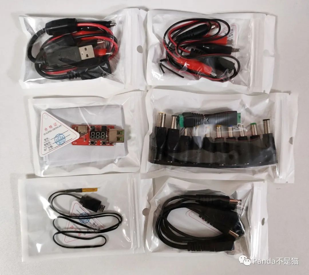 熊猫这里做一下介绍,以下图为例从左到右从上到下,依次为:USB公母转鳄鱼夹线、DC5.5鳄鱼夹线、PD出发诱导器、DC5.5转接头大全(12种)、温度传感器以及DC一拖四公头线。种类太多了,基本上满足你家里的大部分设备了。
