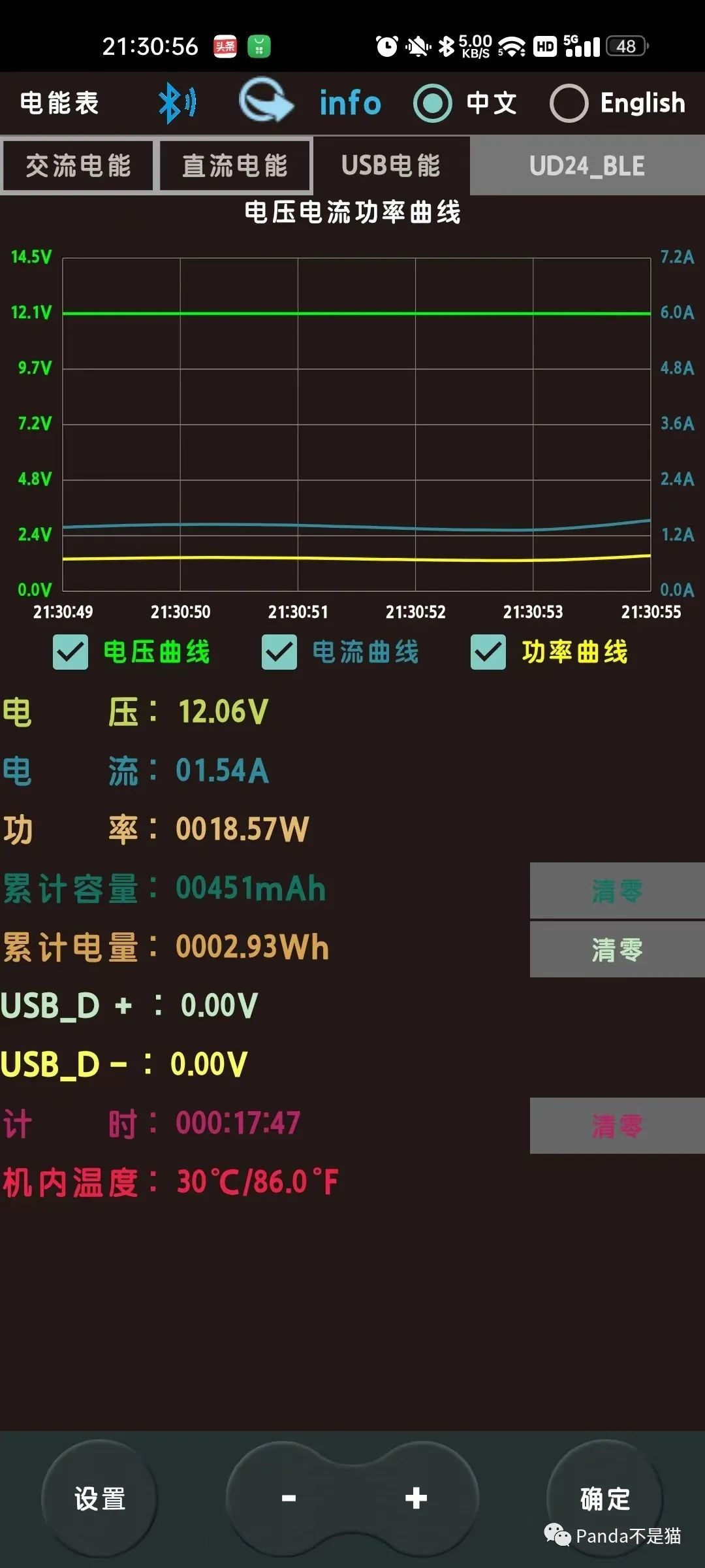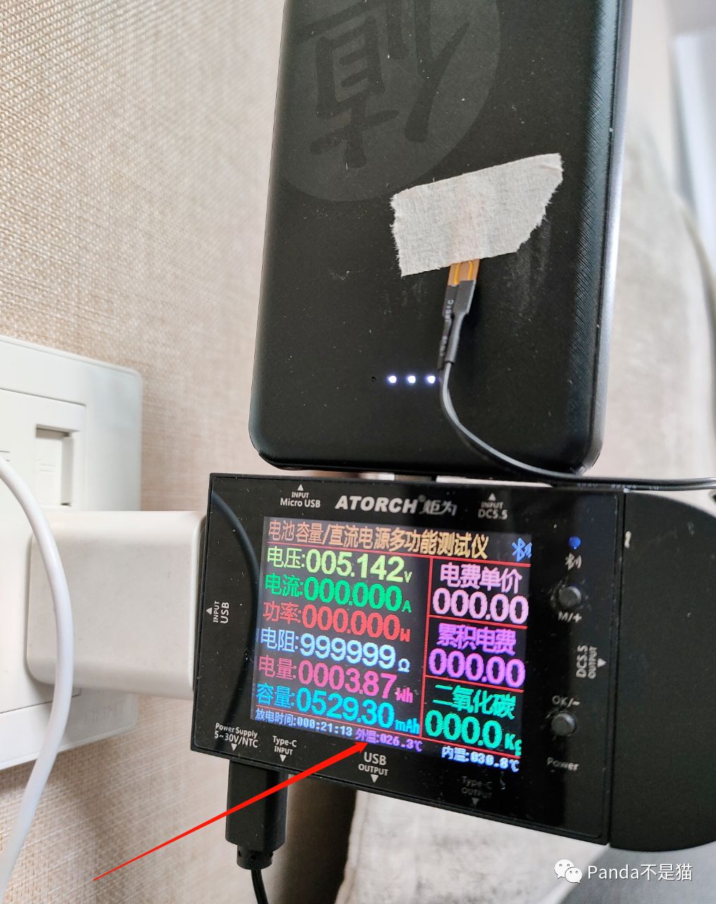 前面提到了配件中是带有温度传感器的,于是乎我拿出了值得买的充电宝,撕开一小截的纸胶布将温度传感器的末端贴在充电宝上,再将传感器的usb接口接入检测仪,于是乎变有个如下的温度显示情况。