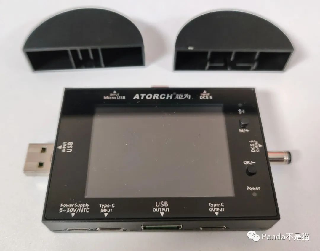 主机的设计很巧妙,正面也印有每个接口对应的型号以及IN或者out。和常见的只能用于手机充电器以及充电宝之类常规USB设备以及Type-c设备不同的是炬为添加了DC5.5的接口,再配合齐全的配件,能满足家用大部分设备的测试。