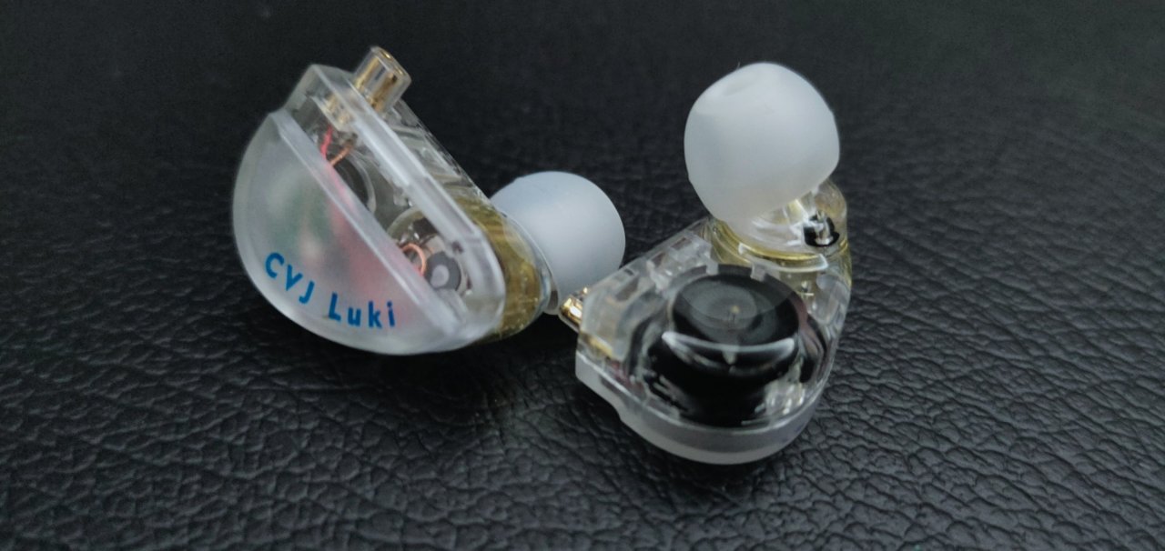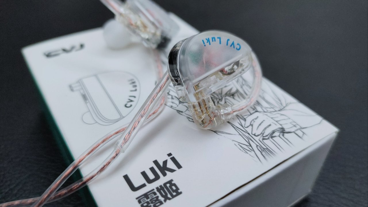 我手中这款呢为白色无麦版本,腔体采用树脂作为材料,外观方面做了半面磨砂雾透,磨砂面写着CVJ LUKI也就是此次产品的名称,半面透明的处理,在可以看到内部构造的同时还增加了一股神秘的魅力,整体的颜值方面个人感觉还算不错。